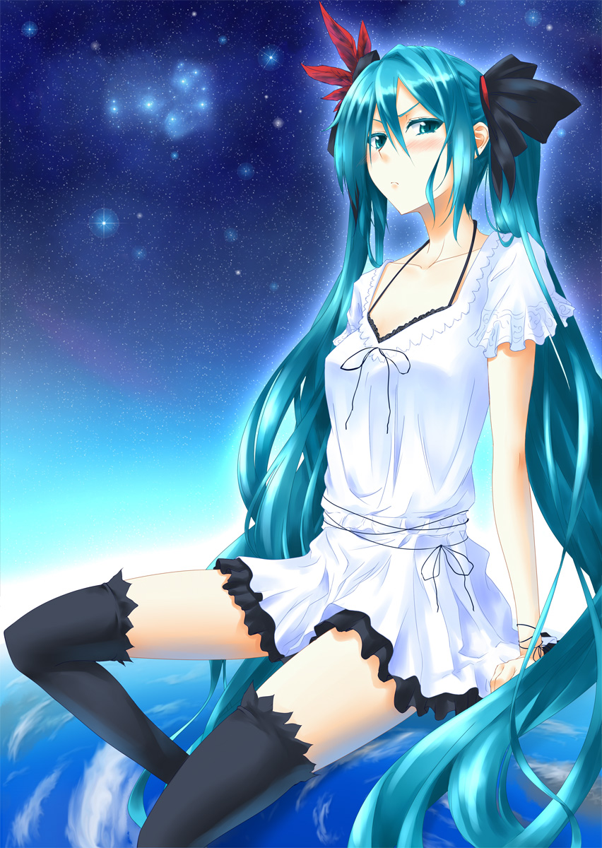 moika (moikaloop), 1girl, arms behind back, artist name, bare shoulders, beige skin, black background, blue eyes, breasts, cleavage cutout, clothing cutout, curvy, detached sleeves, ear piercing, evil smile, feet out of frame, fishnets, makeup, medium breasts, navel, piercing, shaved head, sitting, smile, social media composition, sol matoi, spiked hair, teeth, thick thighs, thighhighs, thighs, thong