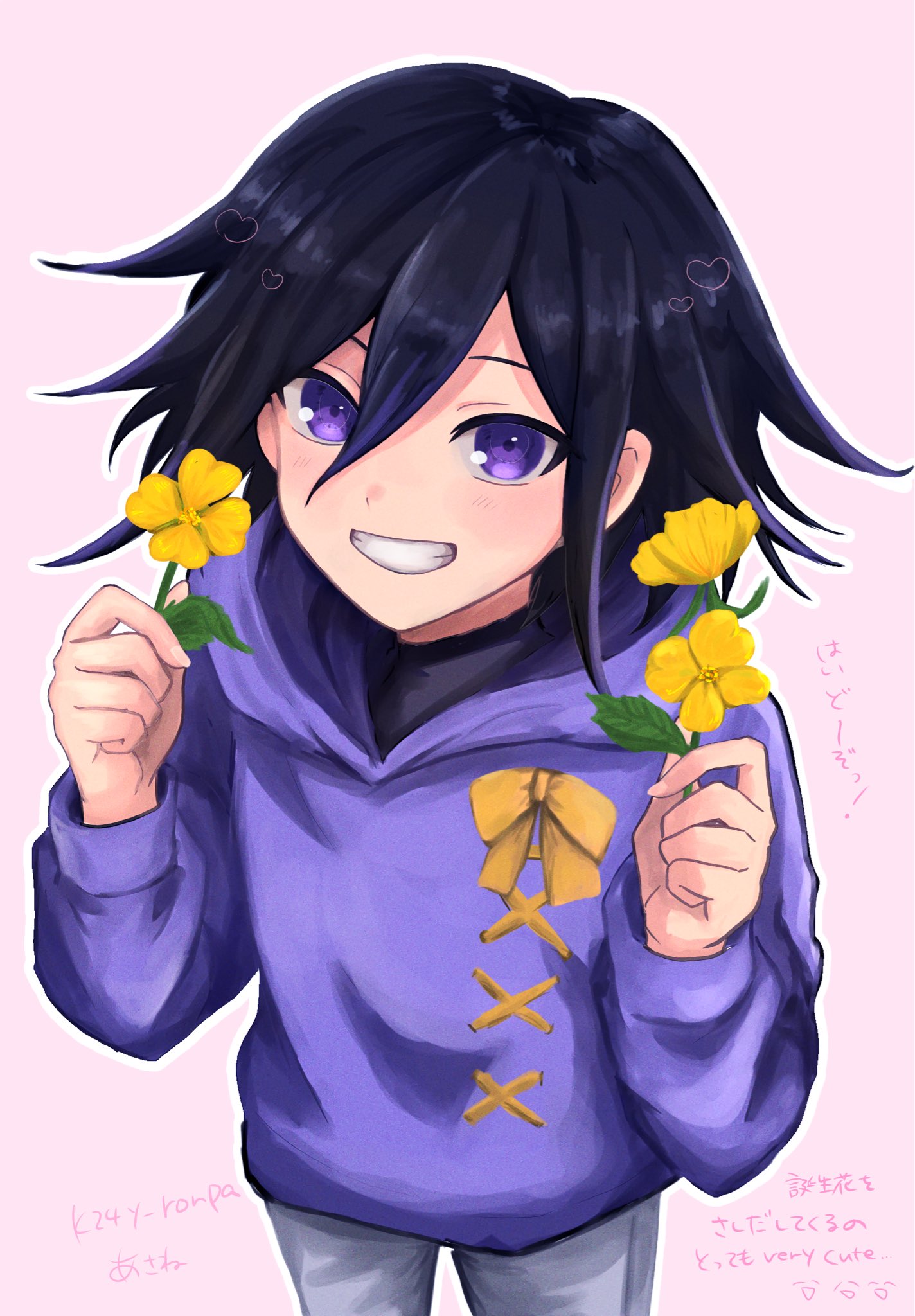 1boyalternate costumeblack hairblushcowboy shotcross-laced clothesflipped hairflowerfrom abovegrinhair between eyeshands upholdingholding flowerhoodhood downhoodiek24y ronpalong sleeveslooking at viewermale focusmedium hairoutlinepantspink backgroundpurple eyespurple hairpurple hoodiesimple backgroundsmilesoloteethwhite outlineyellow flower