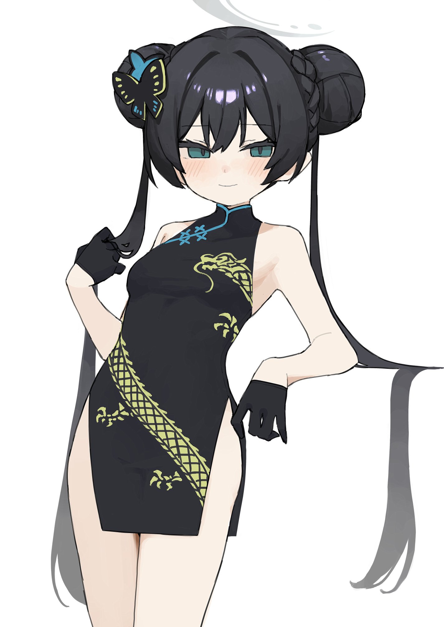 1girlbare shouldersblack dressblack glovesblack hairblushbreastschina dresschinese clothesclosed mouthdouble bundressgloveshair bunlong hairlooking at viewersimple backgroundsmilesolothighstwintailsvery long hairwhite background