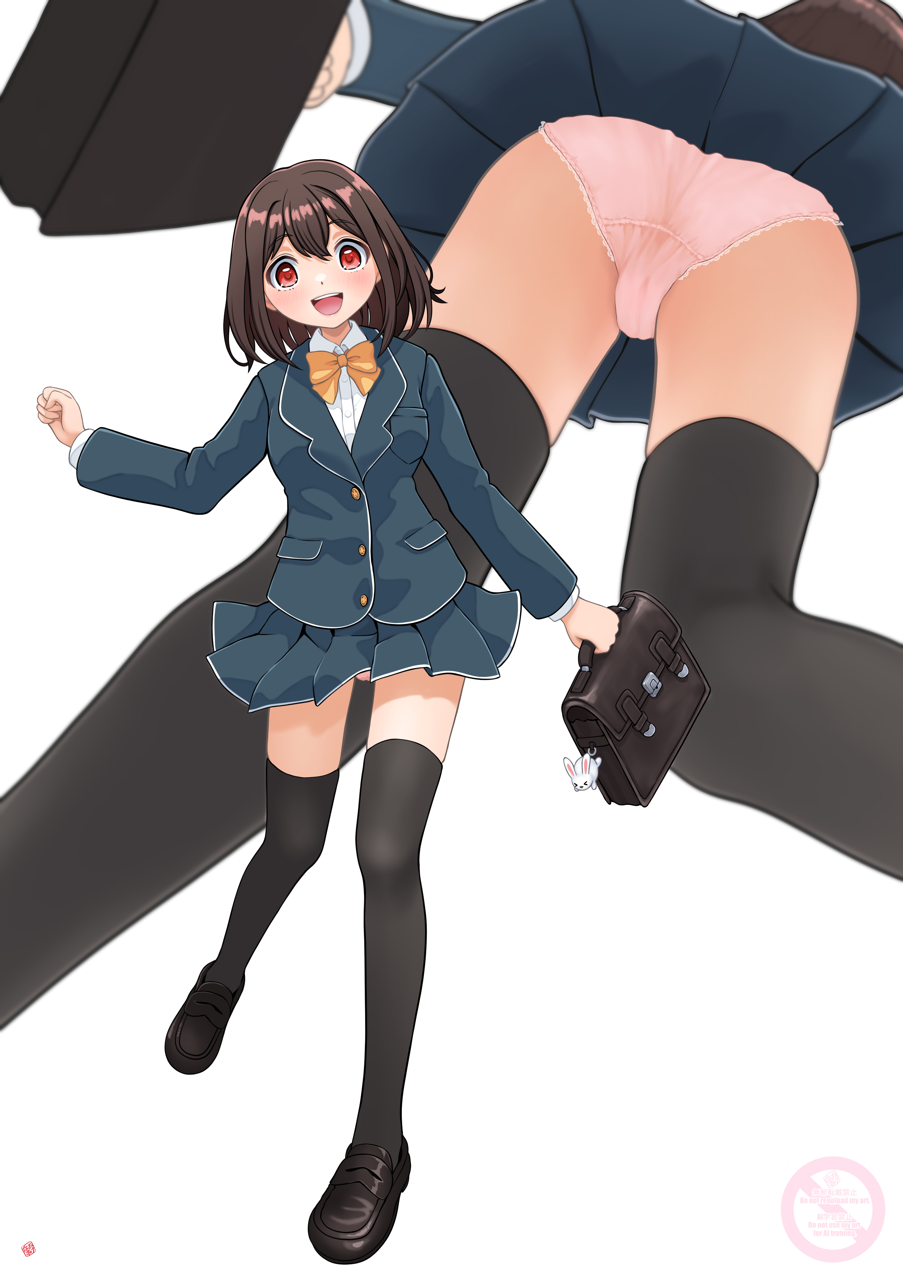 1girlassbagblack shoesblack thighhighsblazerblue jacketblue skirtbowbowtiebreastsbrown hairholdingholding bagjacketlayered sleevesloaferslong sleevesmedium hairminiskirtmtu virusmultiple viewsopen mouthorange boworange bowtiepantiespantyshotpink pantiespleated skirtred eyesschool uniformshirtshoessimple backgroundskirtsmall breastssmilethighhighsunderwearupskirtwhite backgroundwhite shirt