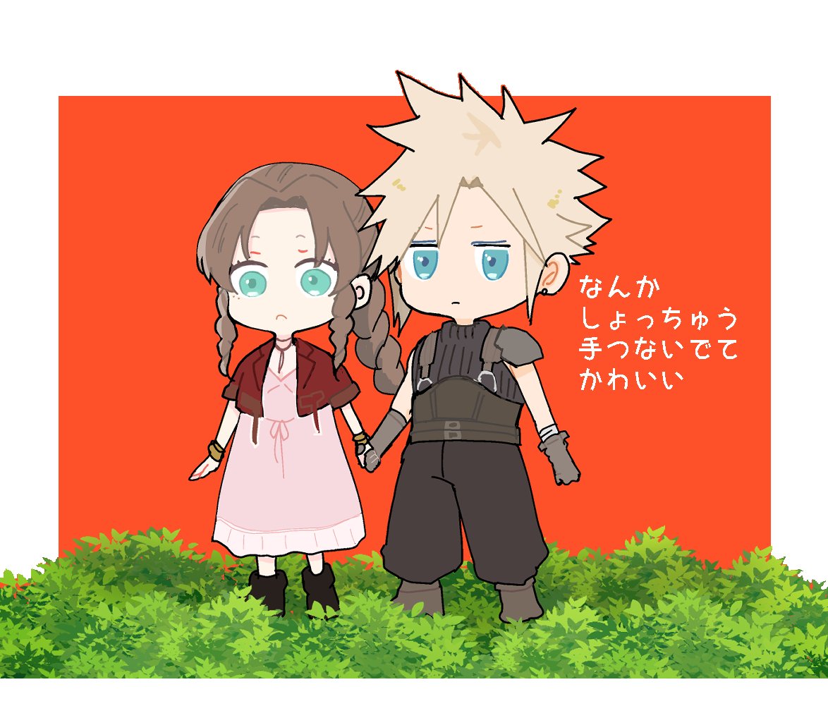 1boy1girlaqua eyesarmorbanglebeltblack pantsblack shirtblonde hairbootsborderbraceletbraidbraided ponytailbrown beltbrown hairchibicropped jacketdressearringsglovesgreen eyesholding handsjacketjewelrylong dresslong hairmultiple beltspantsparted bangspauldronspink dressred backgroundred jacketshirtshort hairshoulder armorsidelockssingle braidsingle earringsingle pauldronsleevelesssleeveless turtleneckspiked hairsuspendersturtleneckwhite border