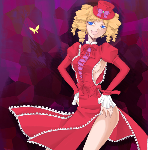 00s1girlblonde hairblue eyesbowbreastsbugbutterflyfemale focushatinsectmini hatmini top hatpink bowribbonsideboobsolotop hat