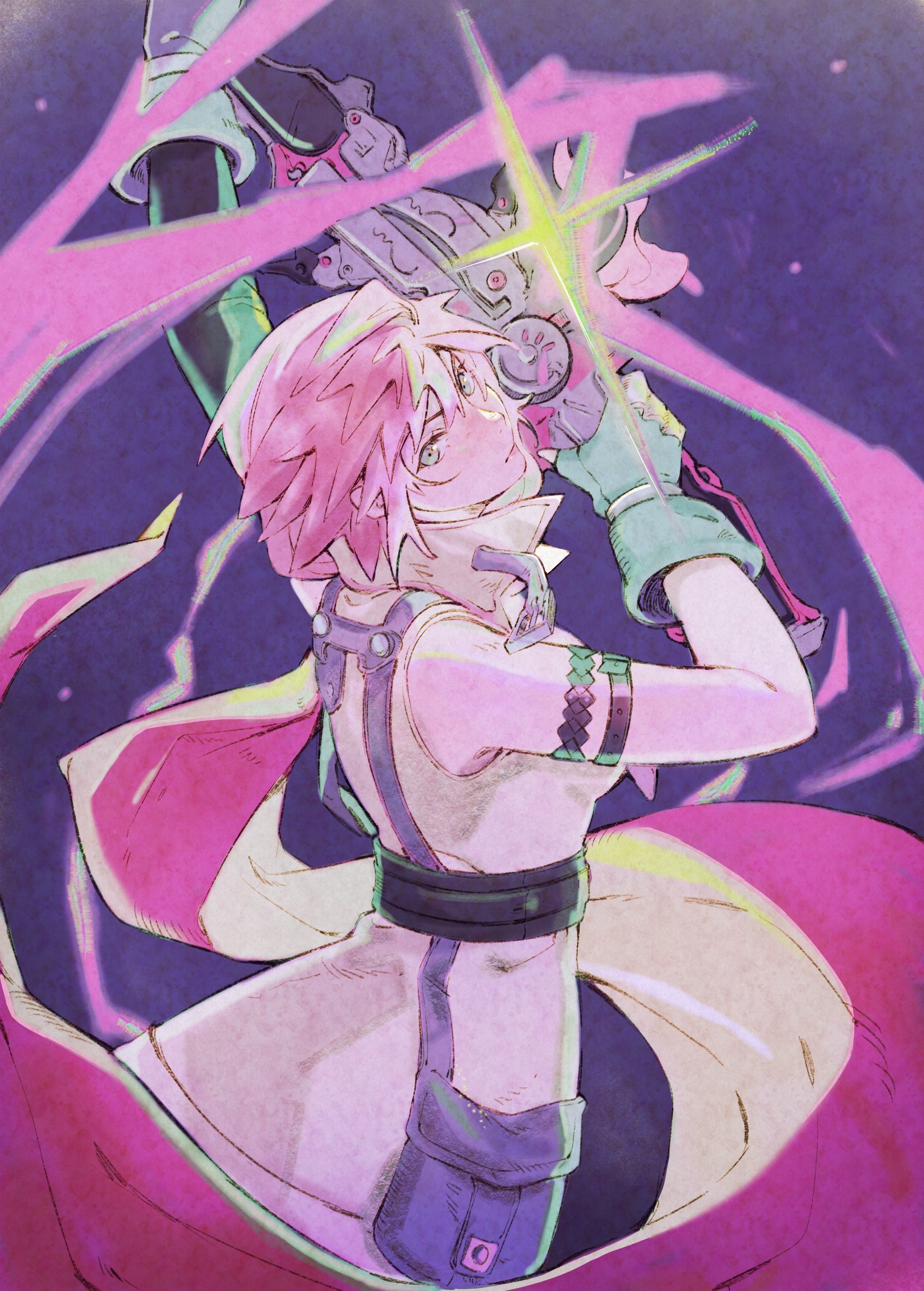 1girlaqua eyesarmletasymmetrical glovesbare shouldersbreastscapeelbow glovesfingerless glovesglovesgunbladehair between eyesholdingholding weaponjewelrylooking at viewermedium breastspink hairpopped collarred capesingle elbow glovesoloupper bodyveilweaponwhite veil