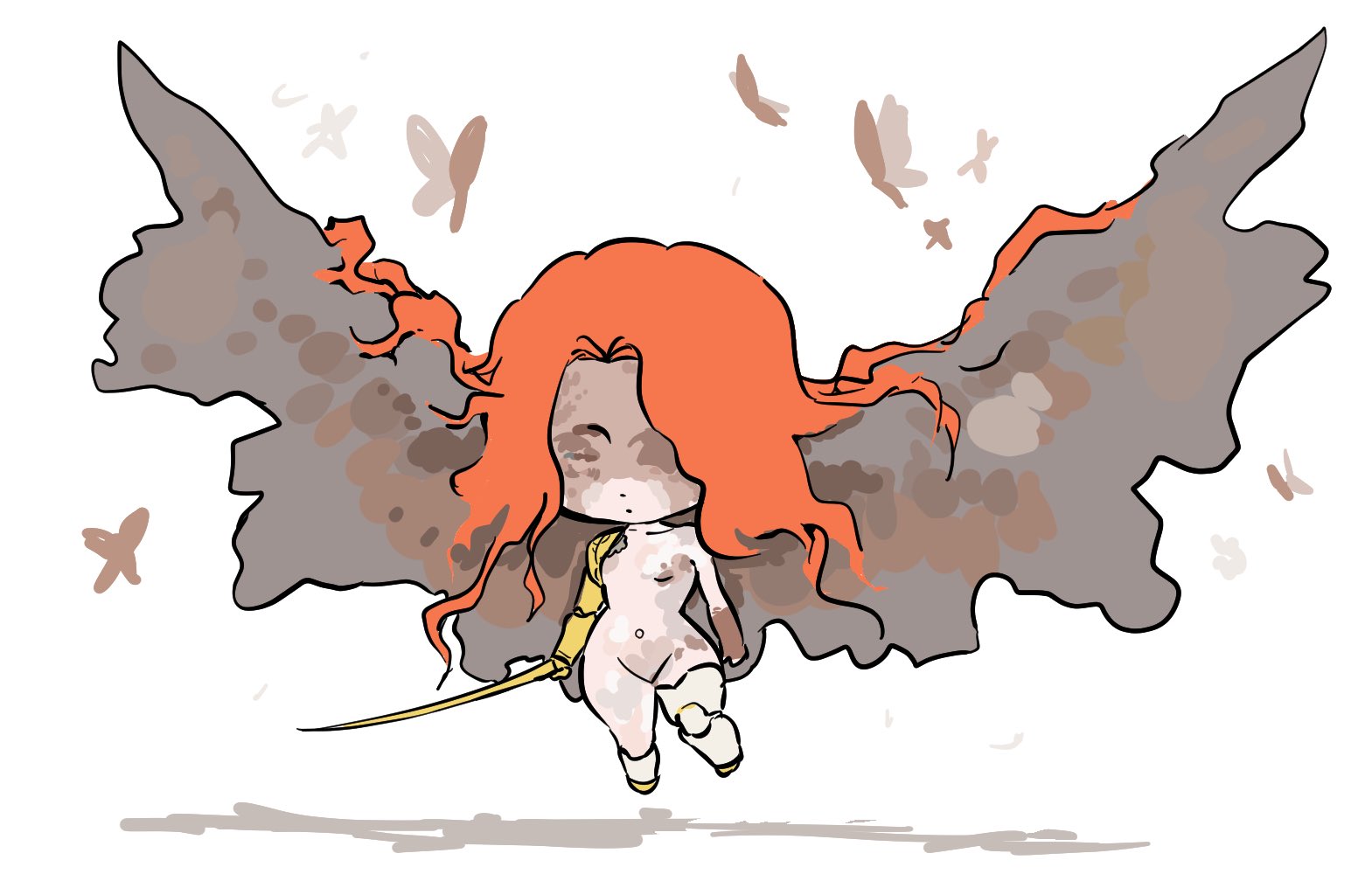 1girlbugbutterflychibichibi onlyfacing viewerfull bodyholdingholding swordholding weaponhollow eyesinsectlong hairno mouthprosthesisprosthetic armprosthetic legred hairscarscar on facesimple backgroundsoloswordweaponwhite backgroundwings
