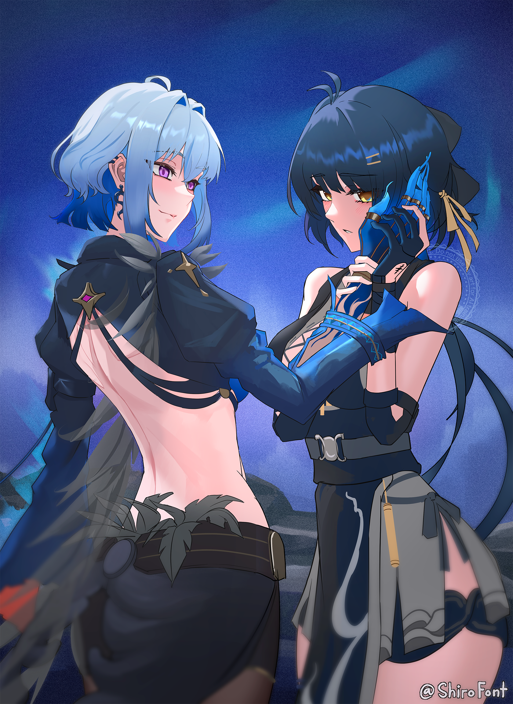 2girlsbackbare shouldersblack dressblack glovesblack hairblack jacketblack shortsblue hairblue nailsbreastscolored inner haircropped jacketdressearringselbow padsglovesgrey hairhair ornamenthaircliphand on another's cheekhand on another's facejacketjewelrylarge breastslight blushlong hairlooking at anothermedium hairmulticolored hairmultiple girlsmutationout of frameparallel hairclipsparted lipspurple eyesshortssidelockssleevelesssleeveless dresssmilesolo focustacet mark (wuthering waves)twitter usernamevery long fingernailswatermarkyellow eyes