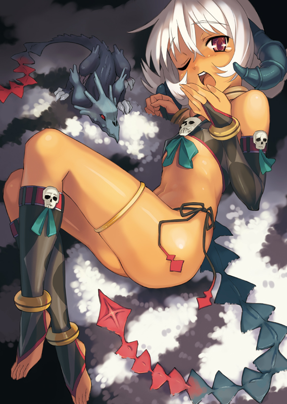 1girlbandeau bikinibarefootbikinibridal gauntletsdark skindark-skinned femaledemon girlfeetfemale focusflat chestgloveshornslizardlyingone eye closedred eyesshort hairside-tie bikini bottomsoloswimsuittailthighhighstoeless legweartoeswhite hairwinkyawning