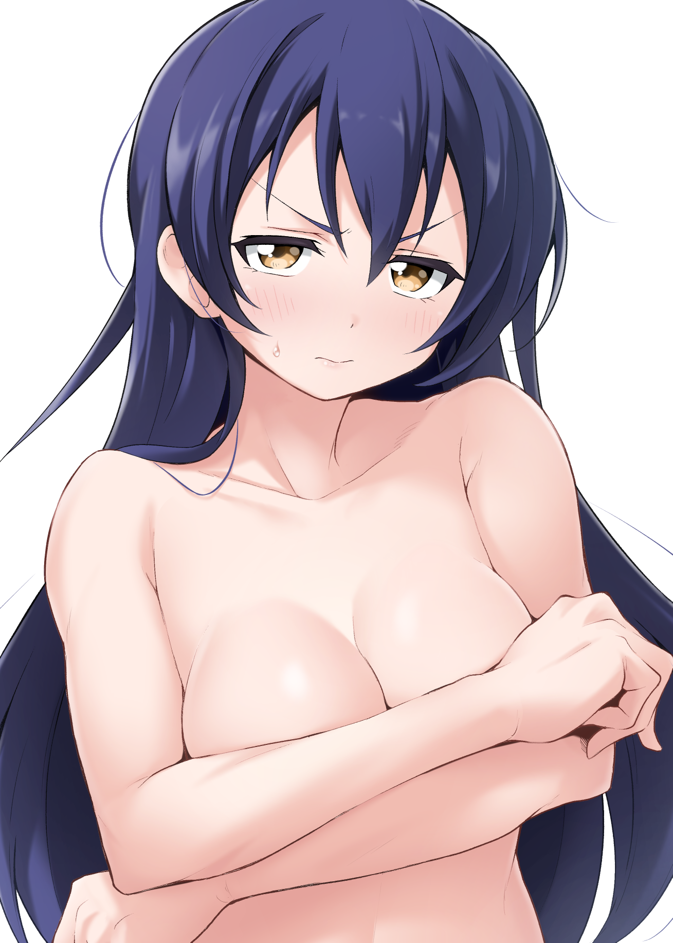 1girlblue hairblushbreastsbrown eyescleavageclosed mouthcollarbonecompletely nudecovering breastscovering privateshair between eyeslooking at viewermedium breastsnudescowlsidelockssimple backgroundsolosweatupper bodyv-shaped eyebrowswhite background