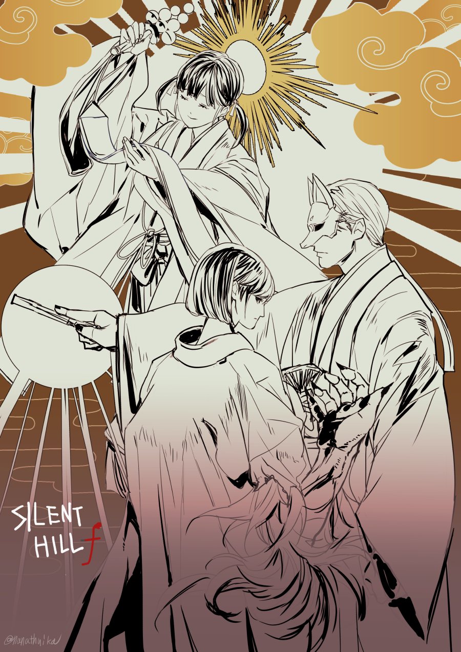 1boy2girlsblack hairblack nailschihaya (clothing)clawscopyright namefingernailsfox maskhalohand fanholdingholding fanjapanese clotheslong hairlow ponytaillow twintailsmaskmikomultiple girlsponytailsharp fingernailsshort hairtwintailswhite hairwide sleeves