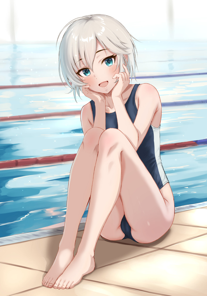 :d1girlahogebarefootblack one-piece swimsuitblue eyesblushbrown haircollarbonefeetfull bodyhair between eyeshands on own faceindoorsknees uplooking at viewerone-piece swimsuitopen mouthpoolpoolsidesittingsmilesoloswimsuitthighstoes