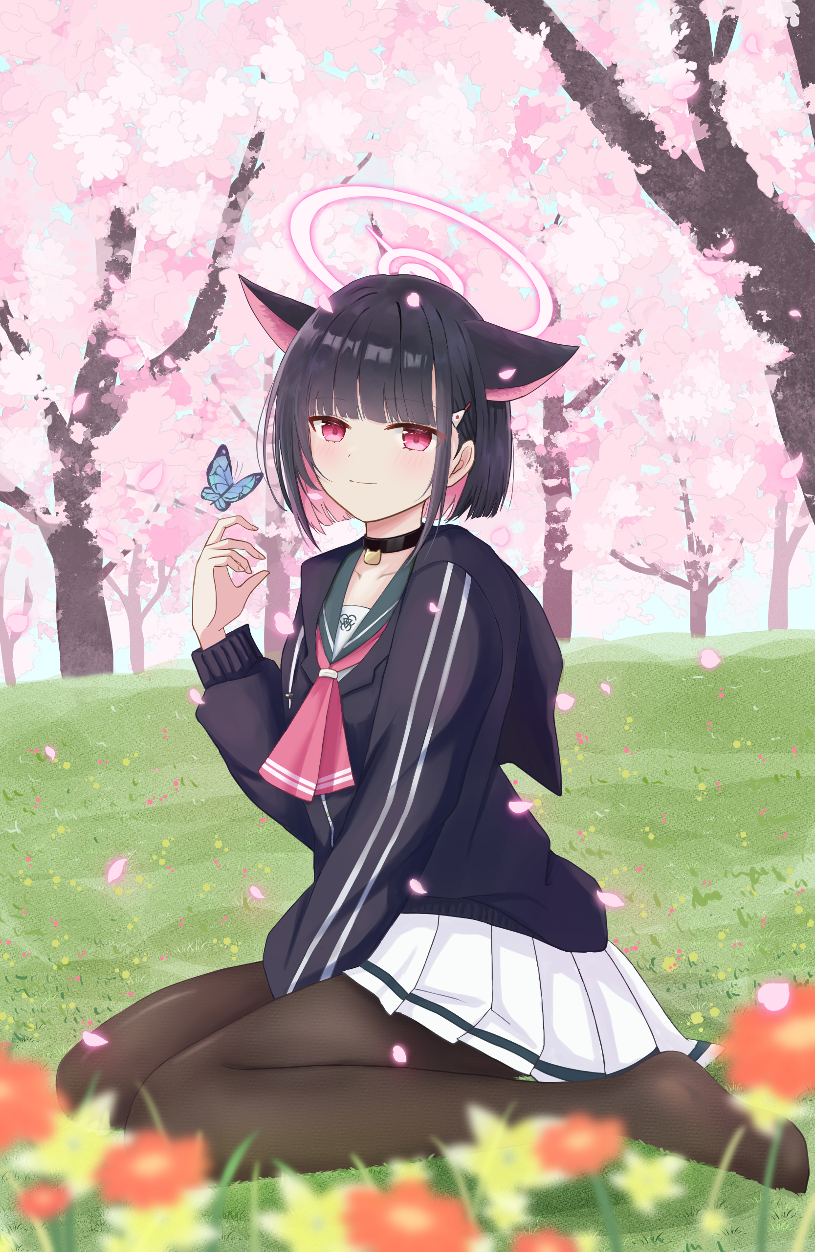 1girlanimal earsblack chokerblack hairblack hoodieblack pantyhoseblue butterflyblunt bangsblurryblushbugbutterflycat chokercat earscat girlcherry blossomschokerclosed mouthcolored inner hairdepth of fieldextra earsfalling petalsflowerfrom sidefull bodygrassgreen sailor collarhair behind earhair ornamenthaircliphalohanamihand uphoodhood downhoodieinsectlong sleeveslooking at animalminiskirtmulticolored hairneckerchiefno shoeson grasspantyhosepetalspink hairpink halopink neckerchiefpleated skirtred eyesred flowersailor collarschool uniformserafukushort hairsittingskirtsmilesolospring (season)straight hairtreetwo-tone hairwarizawhite skirt
