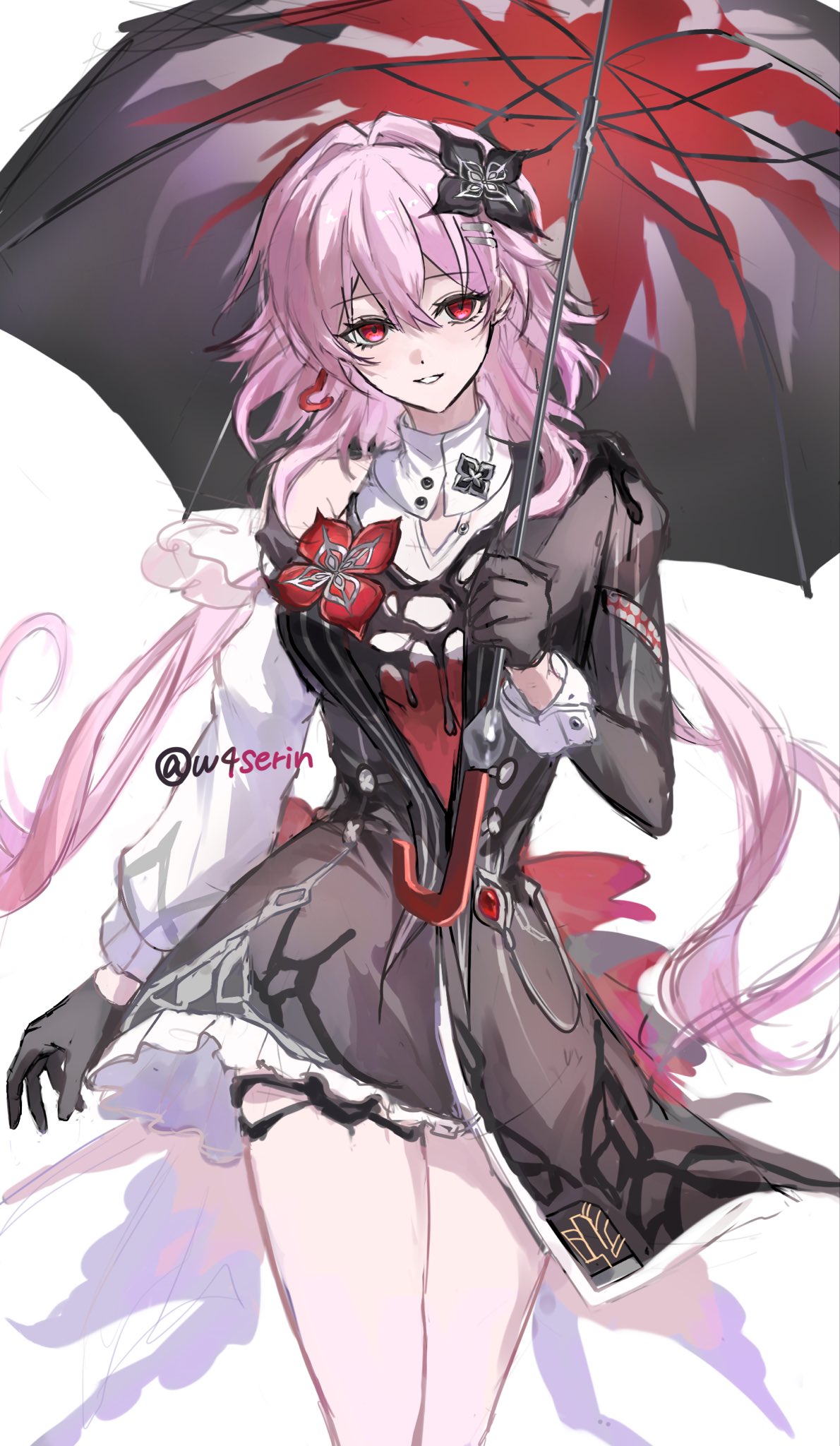 1girlasymmetrical sleevesbuttonscollarcowboy shotearringsflowerfrillsgemgloveshair flowerhair ornamentholdingholding umbrellajewelrylong hairlooking at viewermismatched sleevespink hairred eyesred gemstonesingle bare shouldersingle earringsmilethigh straptwitter usernameumbrellavery long hairwhite background