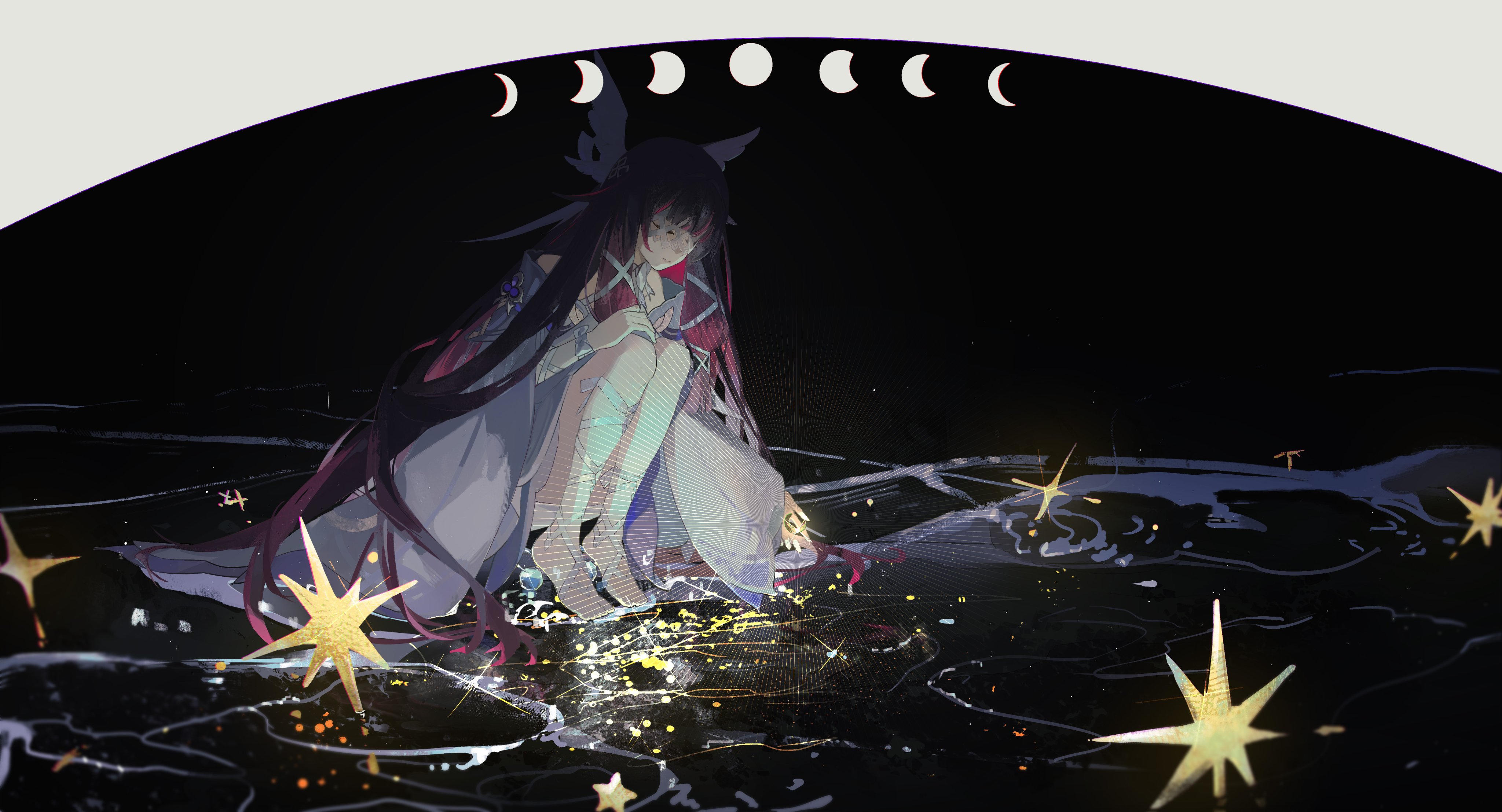 1girlblack hairclosed eyesclosed mouthcrescentdresseye maskfull bodyhair ribbonhead wingslong hairmaskmoon phasesmulticolored hairpink hairribbonsolosquattingstar (symbol)two-tone hairvery long hairwhite dresswhite ribbonwhite wingswings