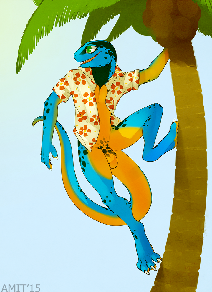 blue skinclawsclimbingclothingFlag for Deletiongeckogreen eyeshawaiian shirthumanoid penislizardmalemale onlypalm treepenisplain backgroundreptilescaliesmilesolospotsteethtreetwo-tone skin