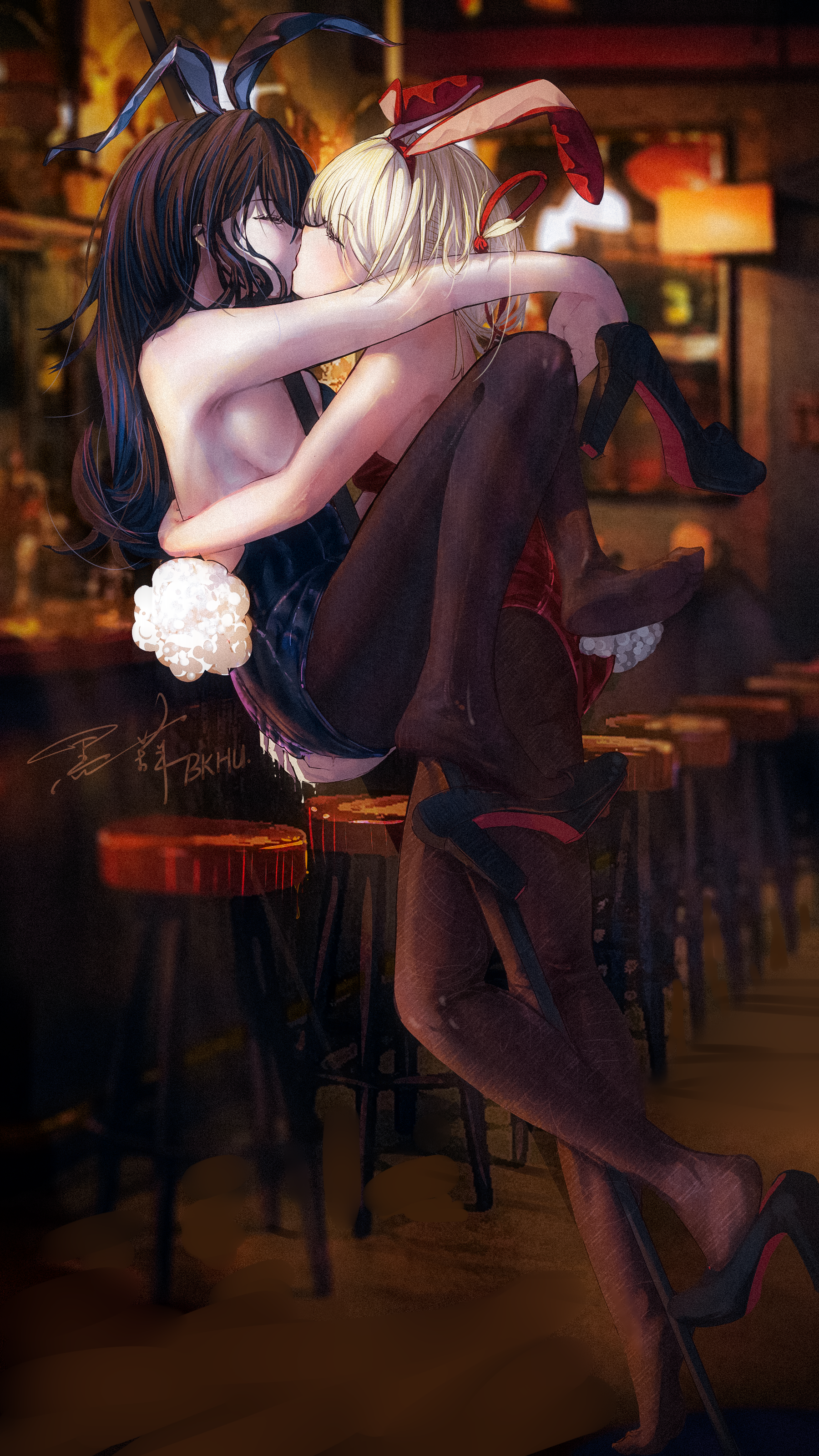 2girlsanimal ear hairbandanimal earsbar (place)black hairblack pantyhoseblonde hairblue leotardbreastsclosed eyesfake animal earsfake tailfingeringfrench kisshairbandhand on another's waisthigh heelsholdingholding shoesholding unworn clothesindoorskisslarge breastsleotardlong hairmedium hairmultiple girlspantyhoseplayboy bunnypussy juicerabbit ear hairbandrabbit earsrabbit tailred leotardshoessideboobsignaturestraplessstrapless leotardtailunworn shoesyuri