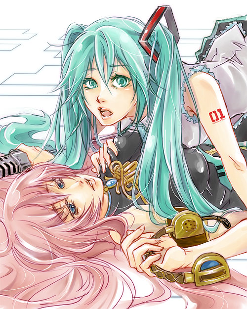 2girlsaqua eyesaqua hairbreastsgrabbing another's breastgropingmedium breastsmultiple girlspink hairsmall breastsyuri