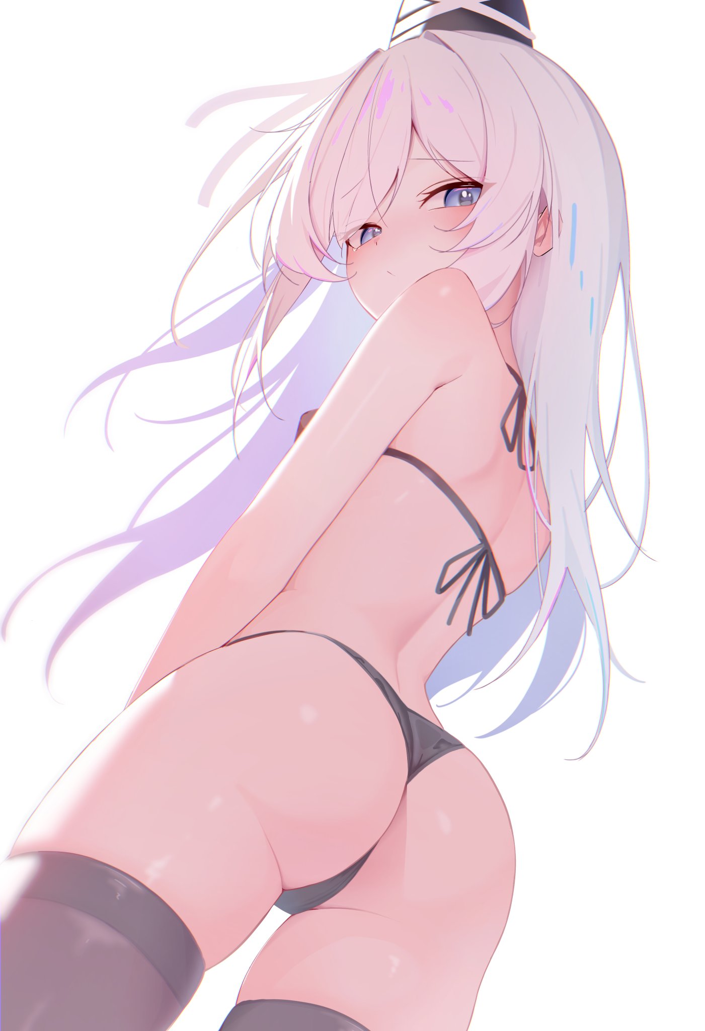1girlassbikiniblack bikiniblack hatblack thighhighsblue eyescowboy shotdutch anglefrom behindhatlight blushlong hairlooking at viewerlooking backsidelockssimple backgroundsoloswimsuitthighhighswhite backgroundwhite hair