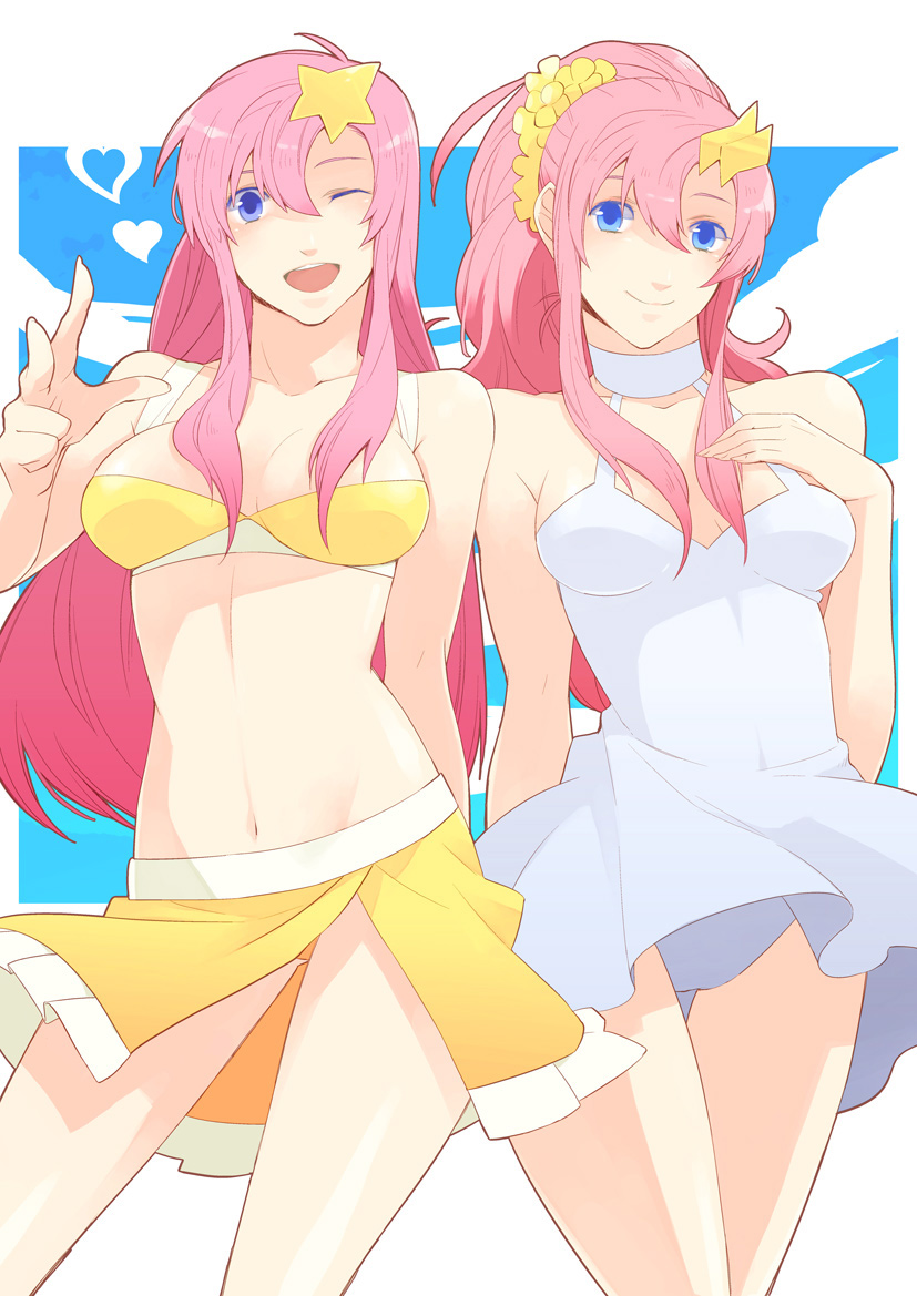 00s2girlsbikiniblue eyeshair ornamentmultiple girlsone eye closedpink hairstar (symbol)star hair ornamentswimsuitwink