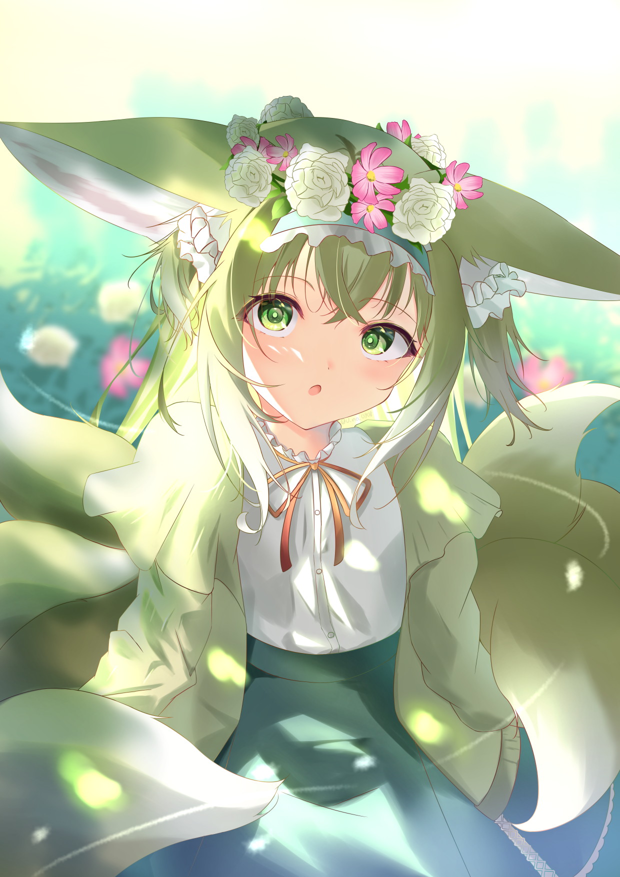 1girlanimal earsblonde haircardigancolored tipsflowerfox earsfox girlfox tailfrilled hairbandfrillsgreen eyesgreen hairbandgreen skirthair flowerhair ornamenthairbandkitsunekyuubilong sleeveslooking at viewermulticolored hairmultiple tailsneck ribbonofficial alternate costumeopen mouthred ribbonribbonshirtskirtsolotailwhite hairwhite shirtyellow cardigan