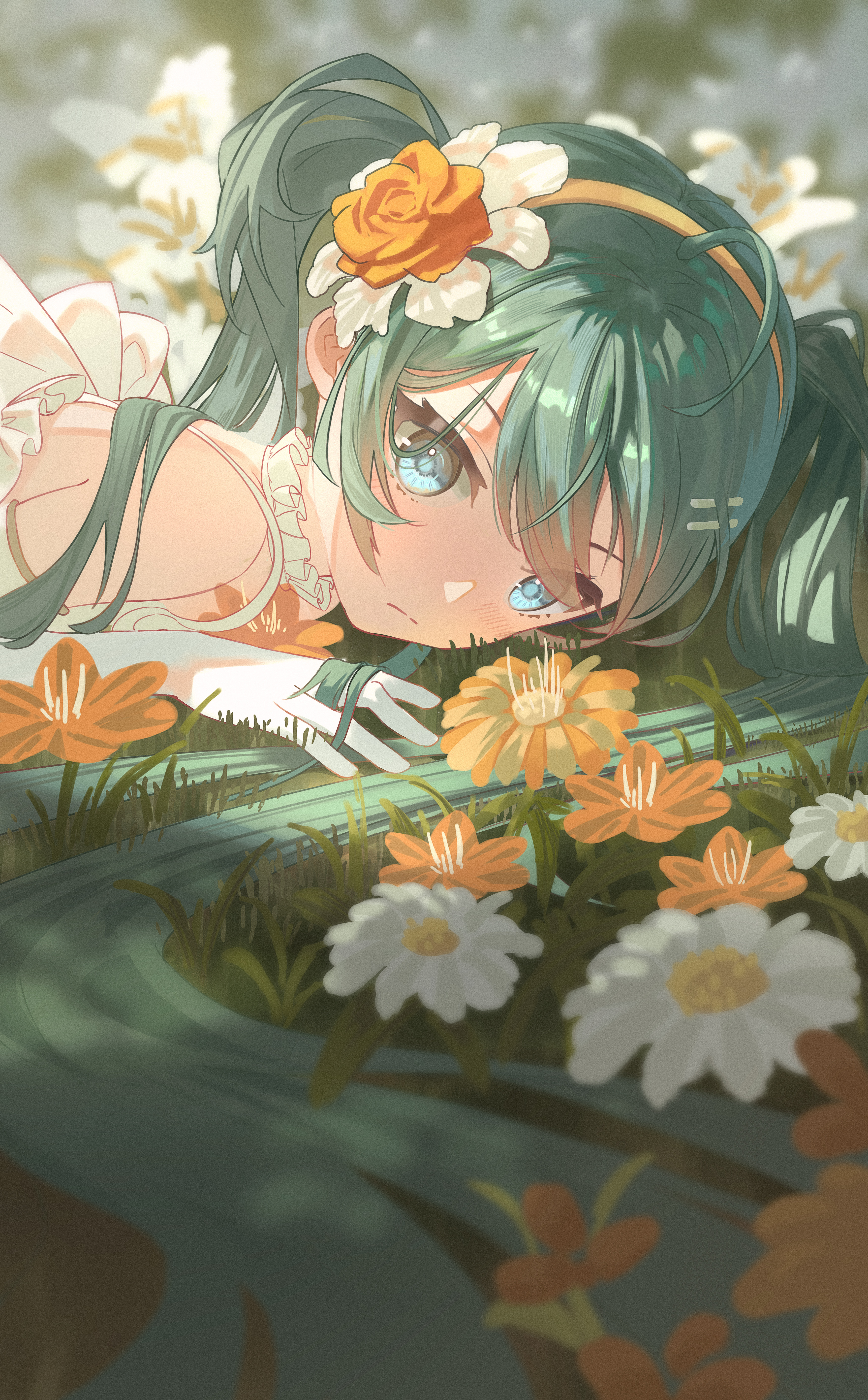 1girlahogeaqua hairclosed mouthdressflowergreen eyeshair between eyeshair flowerhair ornamenthairbandlong hairlong sleeveslooking at viewerlyingon stomachsleevelesssleeveless dresssolotwintailsvery long hairwhite dressyellow hairband