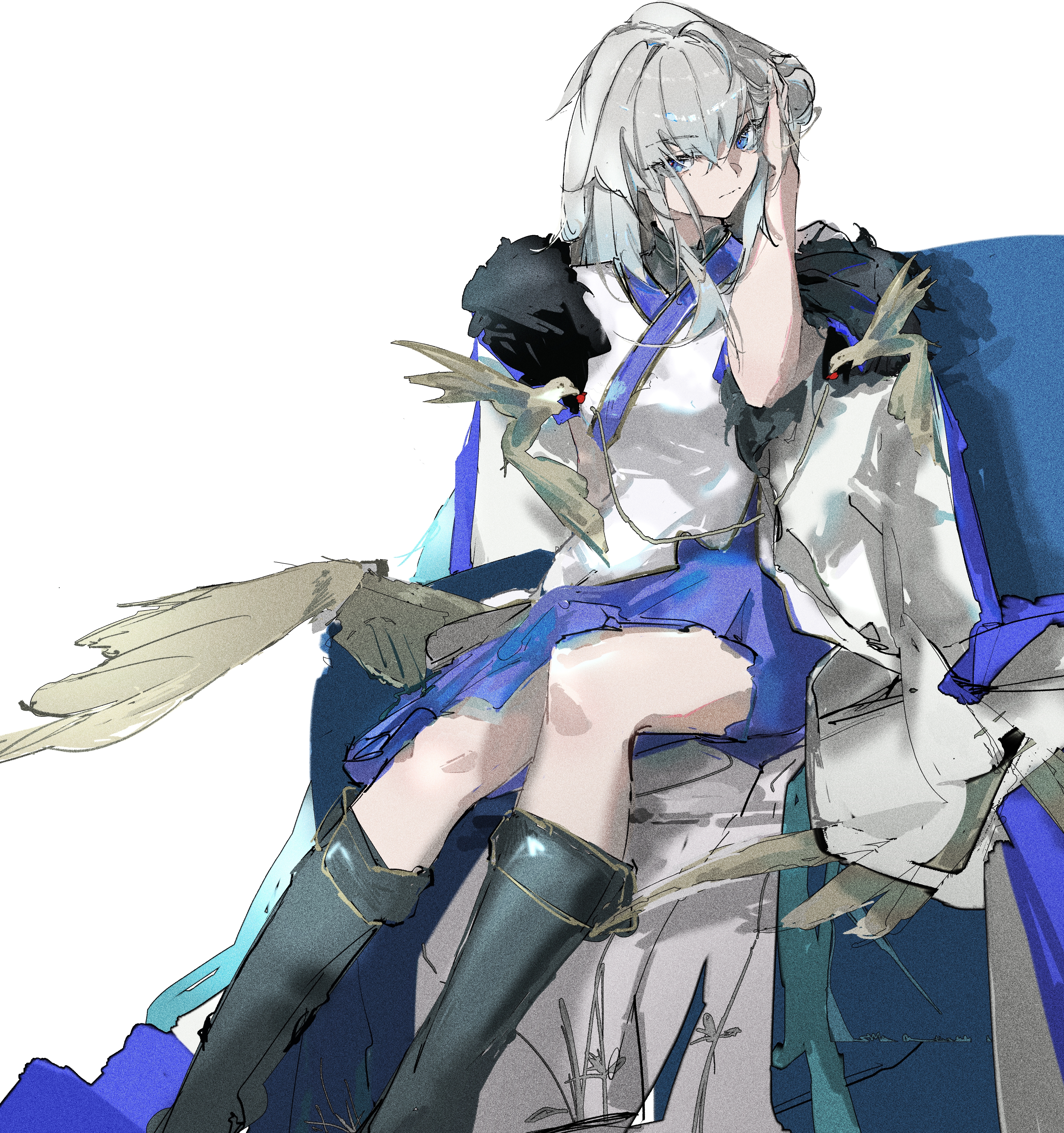 miaka (artist), salty (cherrypie), reinforce zwei, lyrical nanoha, mahou shoujo lyrical nanoha, mahou shoujo lyrical nanoha strikers, 00s, 1girl, ahoge, asymmetrical clothes, asymmetrical legwear, blue eyes, blue hair, character name, female focus, flower, hair ornament, magical girl, matching hair/eyes, sky, solo, thighhighs, uneven legwear, waist cape, watering can, x hair ornament