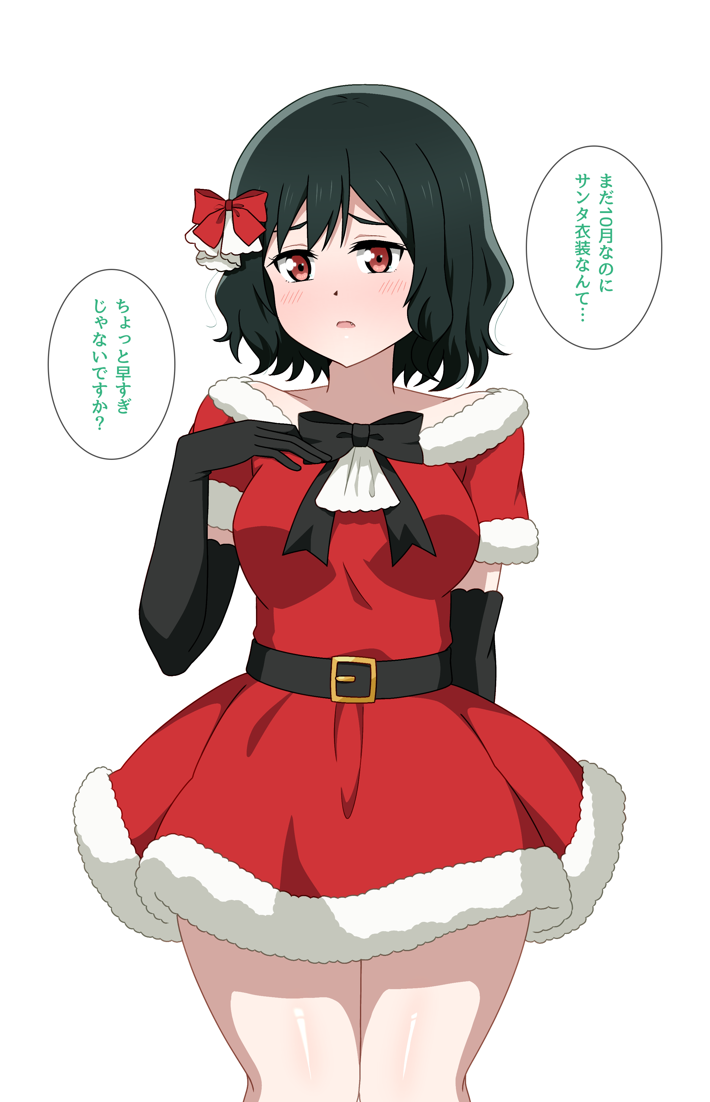 1girlalternate costumeblack bowblack glovesblack hairblushbowdressdress bowelbow glovesfur trimfur-trimmed dressgloveshair bowlooking at vieweroff shoulderoff-shoulder dressopen mouthraised inner eyebrowsred bowred dressred eyessanta costumesanta dressshort dressshort hairsolo