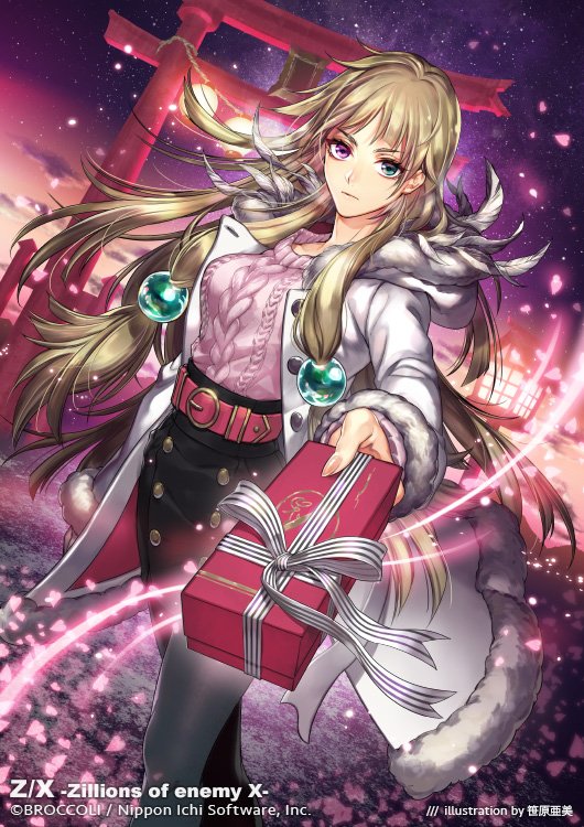 1girlbeltblack pantyhoseblack skirtblonde hairclosed mouthcoatcopyright noticefur trimfur-trimmed coatgiftgreen eyeshair ornamentheterochromiaholdingholding giftlong hairoutdoorspantyhosepink petalspink sweaterpurple eyesred beltsidelocksskirtsolosweatertoriivery long hairwhite coat