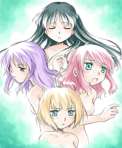 matsuzaki yutaka, misawa hanei, seo akira, tohno akiha, tsukihime souka, tsukihime, 00s, 4girls, balcony, hair between eyes, multiple girls, night, school uniform, serafuku, veranda