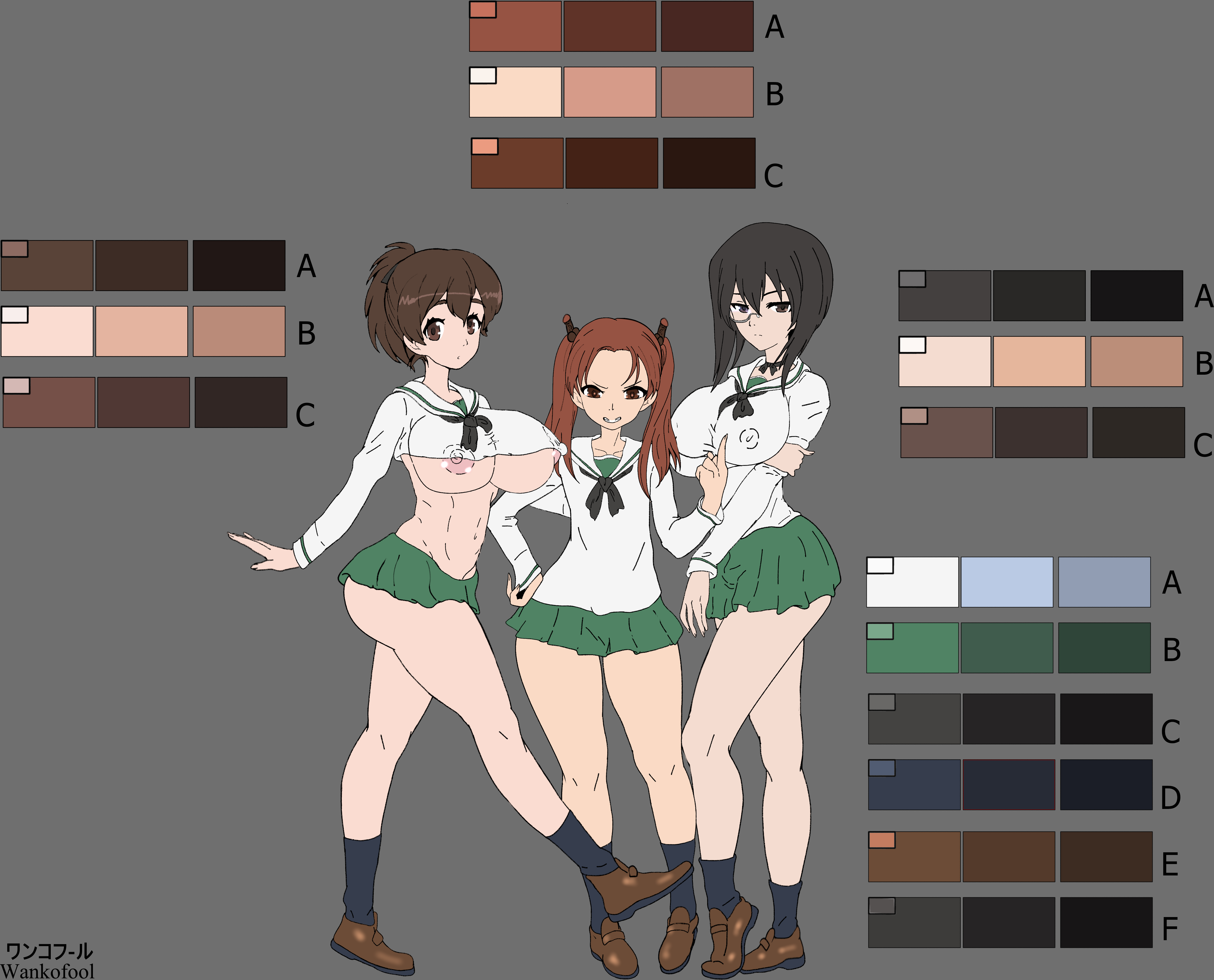 3girlsblack hairbreastsbrown hairgrey backgroundgrinhair ribbonlarge breastslong hairlooking at viewermicroskirtmidriffmonoclemultiple girlsnavelnipplesno braooarai school uniformopen mouthponytailribbonschool uniformsimple backgroundskirtsmall breastssmiletwintailsunderboob