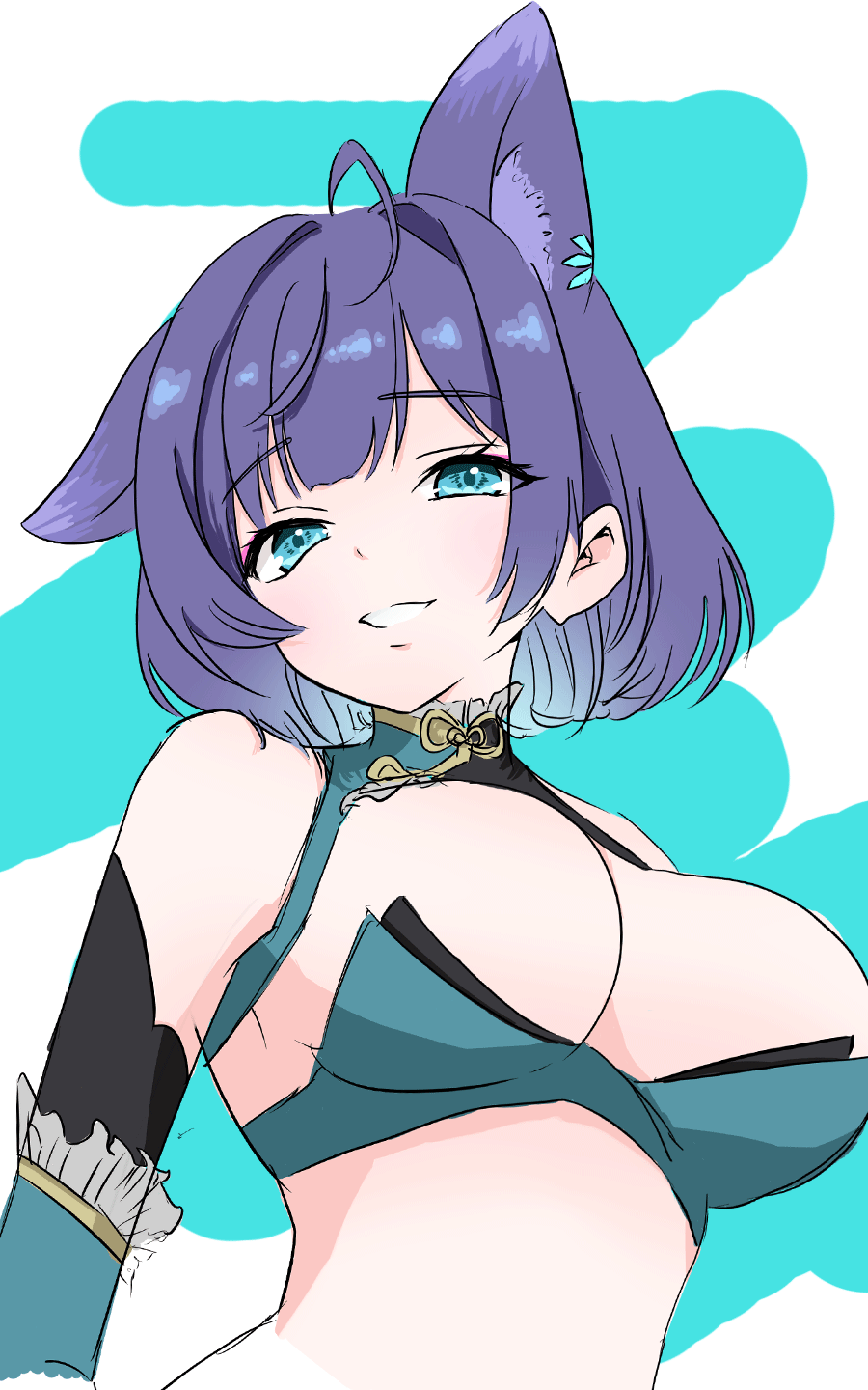 wangpo, sharkry (girls' frontline 2), girls' frontline, girls' frontline 2: exilium, absurdres, hashtag-only commentary, highres, 1girl, alternate costume, animal ear hairband, animal ears, aqua eyes, artist name, bare shoulders, black thighhighs, blue leotard, breasts, clenched teeth, collarbone, detached collar, fake animal ears, hairband, holding leotard, leotard, long hair, looking at viewer, playboy bunny, rabbit ears, side ponytail, simple background, smile, solo, star-shaped pupils, star (symbol), symbol-shaped pupils, teeth, thick thighs, thighhighs, thighs, white background