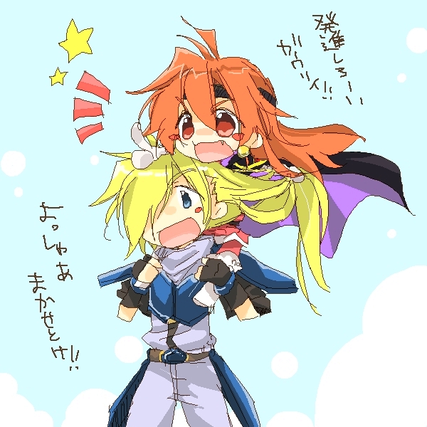 :3blonde hairblue eyescapecarryingfanggrabbing another's hairholding another's hairlong hairoekakiorange hairred eyesshoulder carry