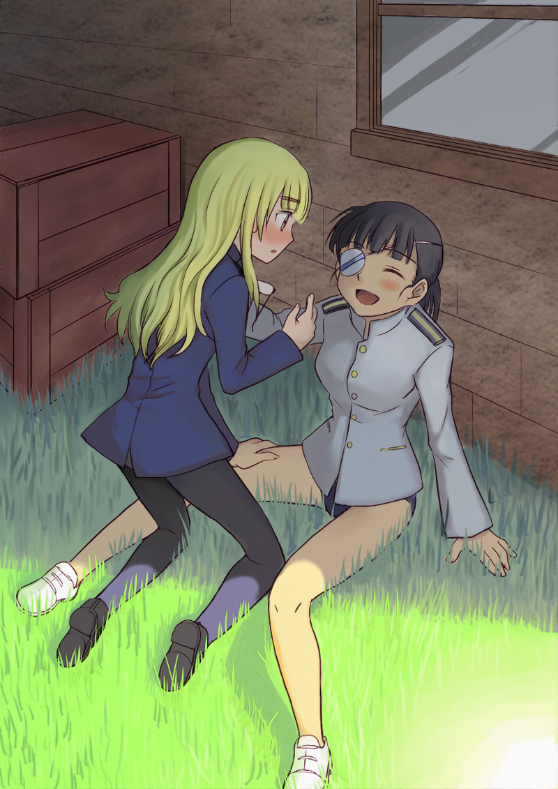 00s2girlsblonde hairblushclosed eyeseyepatchglassesgrasslaughinglegsmultiple girlsno pantsone-piece swimsuitopen mouthpantyhoseponytailschool swimsuitsmileswimsuitswimsuit under clothesyellow eyes