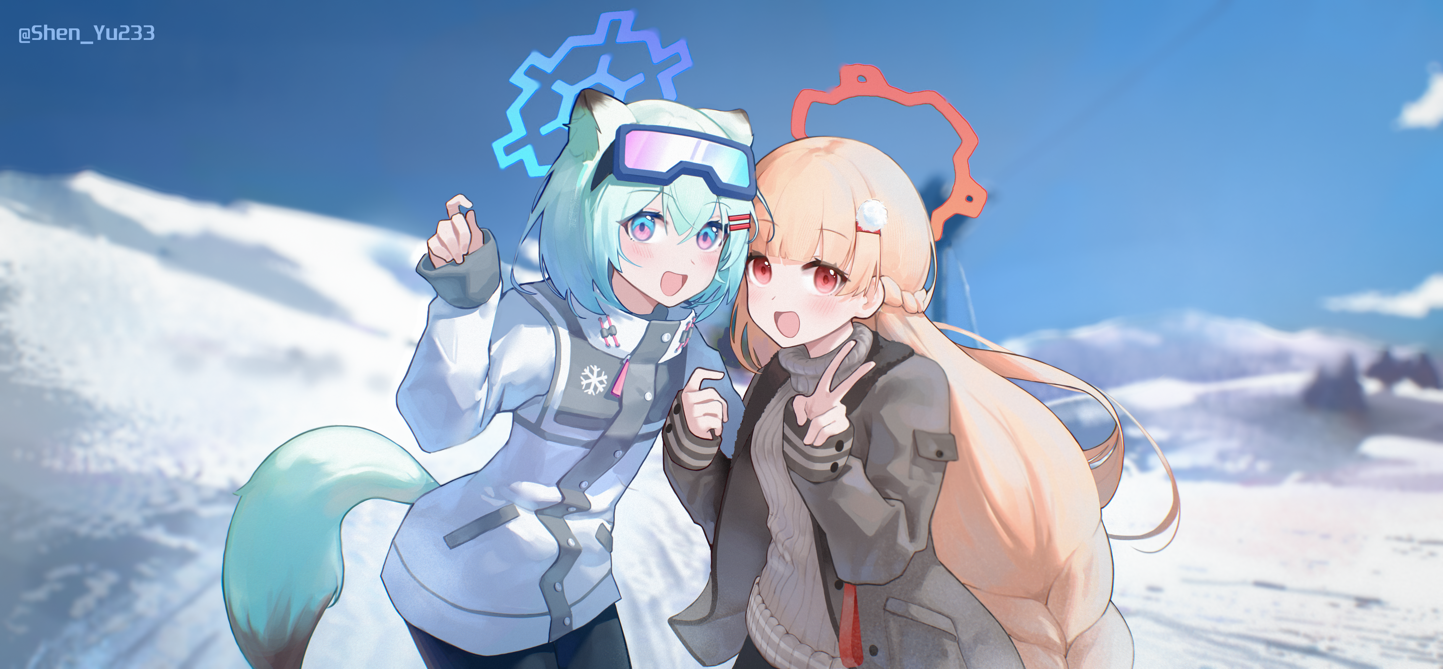 2girlsanimal ear fluffanimal earsaqua hairblack pantsblonde hairblue haloblushbraidbrown jacketgogglesgoggles on headgrey sweaterhair between eyeshalf up braidhalojacketlong hairlooking at viewermountainmultiple girlsopen mouthorange halopantspurple eyesred eyesshort hairsnowsweatertailturtleneckturtleneck sweatervweasel earsweasel girlweasel tailwhite jacket