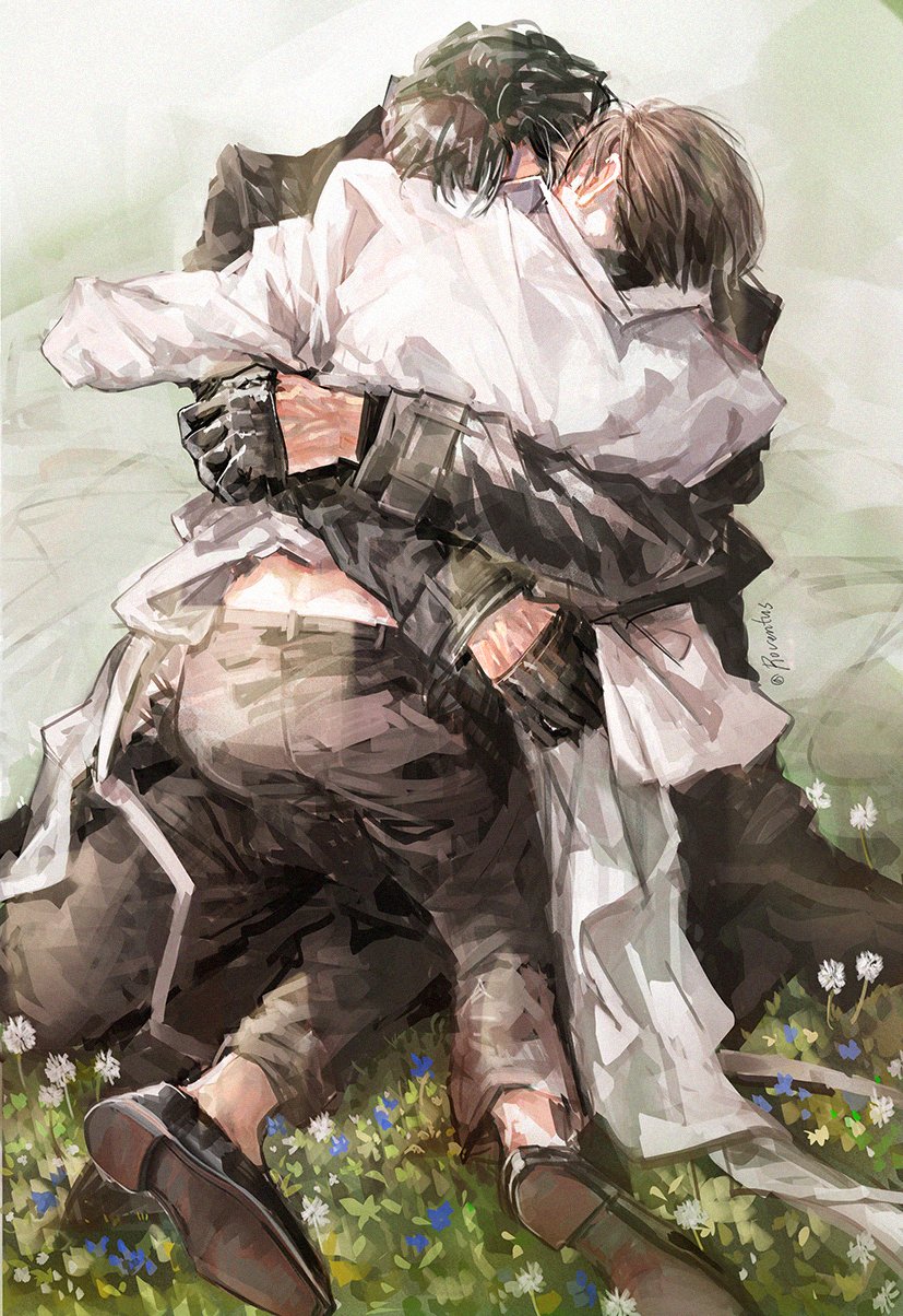 2boysblack coatblack glovesblack haircoatcovered facedaisy (flower)dandeliondayfieldflowerflower fieldfull bodygloveshugkisskneelingmidriffmultiple boysoutdoorsroventusshort hairwhite coatyaoi