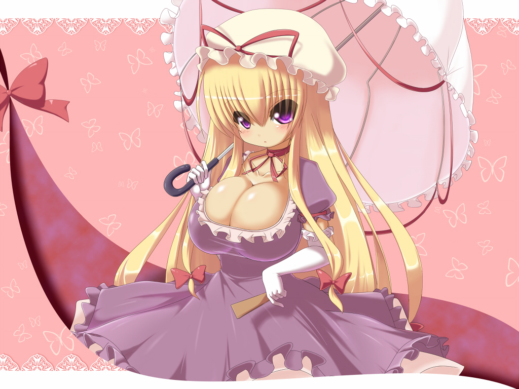 1girlblonde hairblushbowbowtiebreastscleavagedresselbow glovesfemale focusgloveshathuge breastslong hairpurple eyesribbonsoloumbrellavery long hair