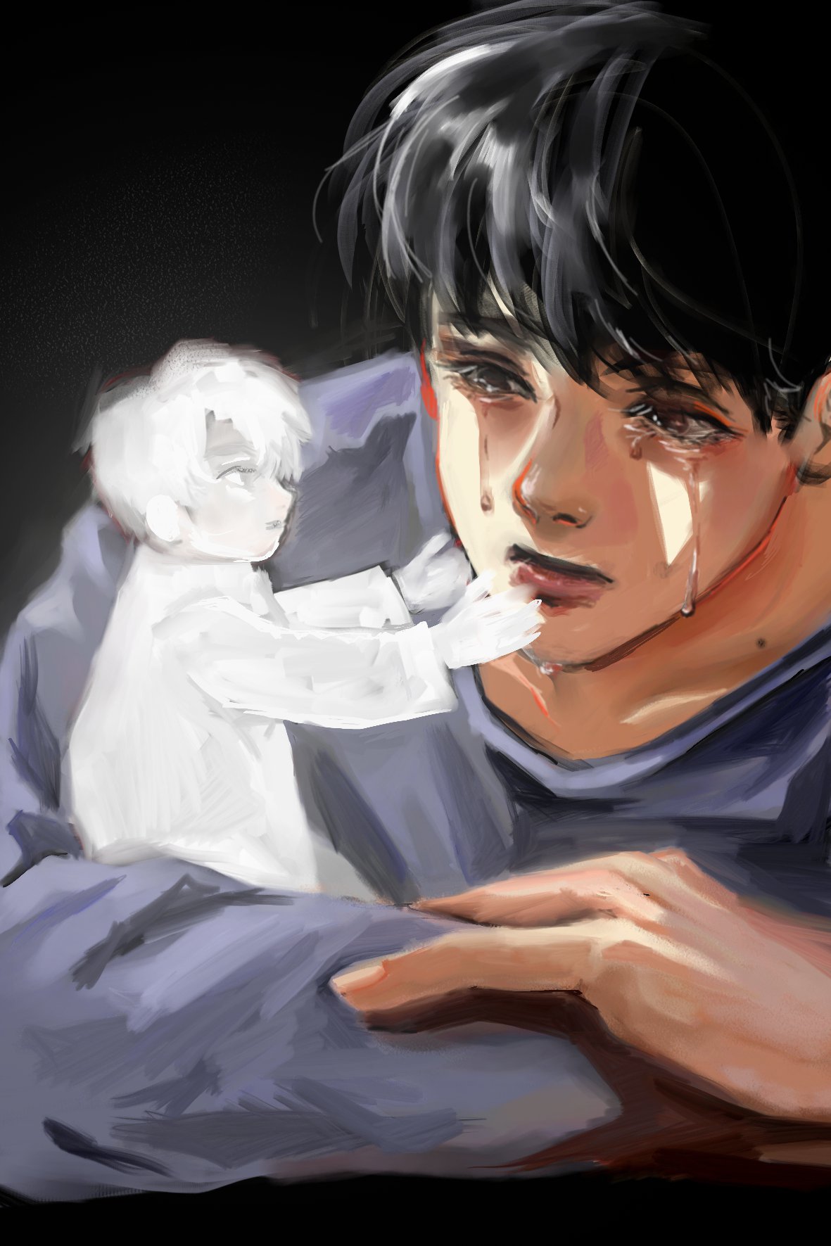 2boysawl inthe worldblack eyesblack hairblue shirtcryingcrying with eyes opendual personaglowinghand on another's facelooking at anothermini personminiboymultiple boysoldest dreamshirtshort hairtearsworried