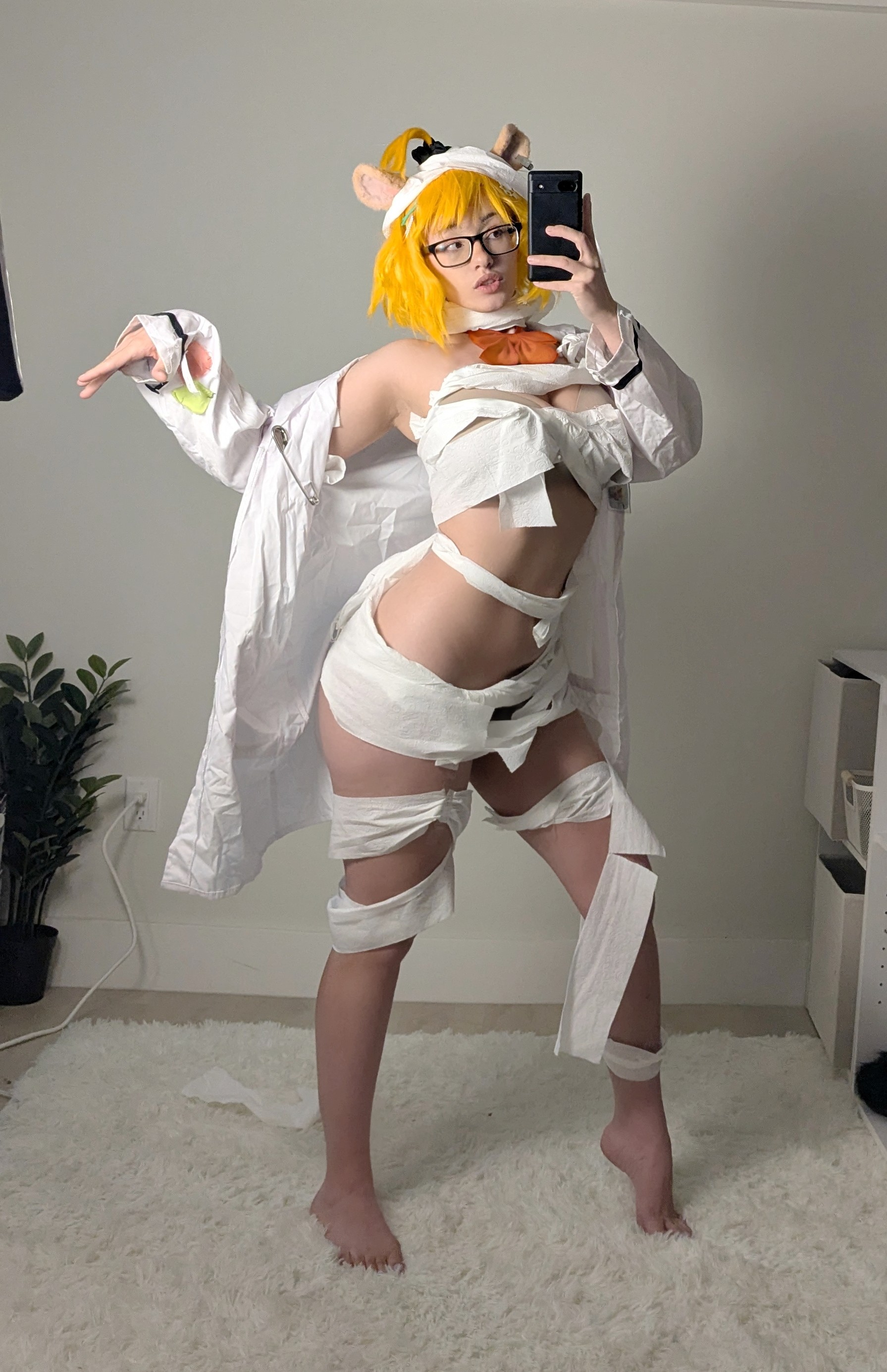 animal earsarmpitsbare shouldersblonde hairbreastscosplaydark skinfeetglassesgumbunhamster earshamster girllab coatlarge breastsmidriffmirror selfieselfiestomach bulgetoestoilet paperwrapping
