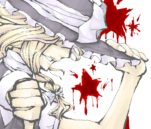 1girlblonde hairbloodfemale focushand on headwearhatoekakiribbonsolothumbs downupper bodywhite backgroundwitchwitch hat