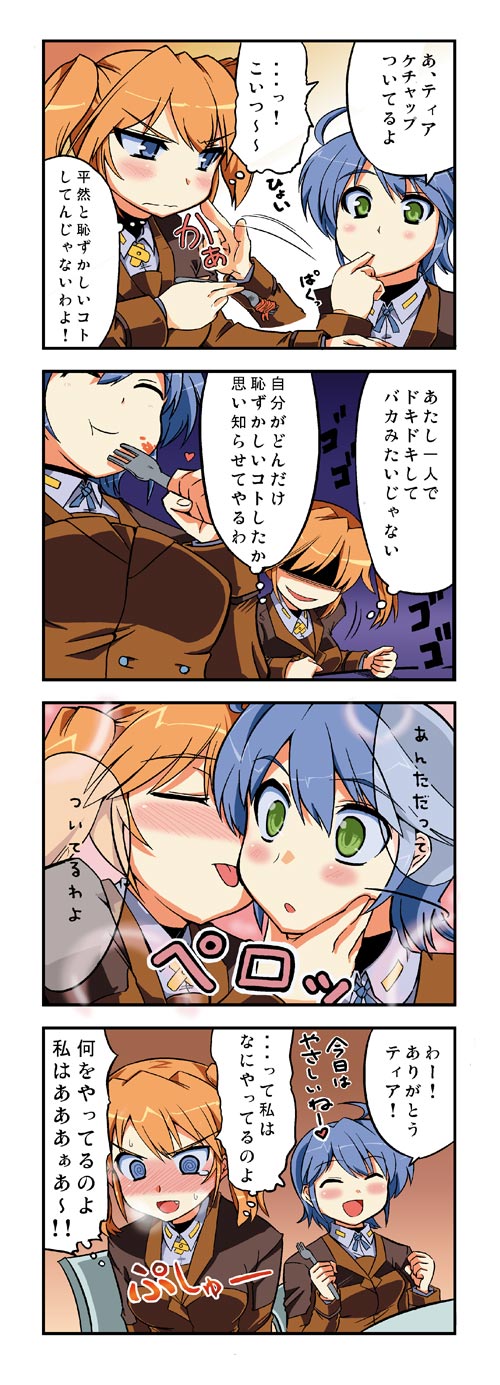 00s4komaahogeblue eyesblue hairblushclosed eyescomiceatingforkgreen eyeslickingorange hairshort hairsmiletonguetwintailsyuri