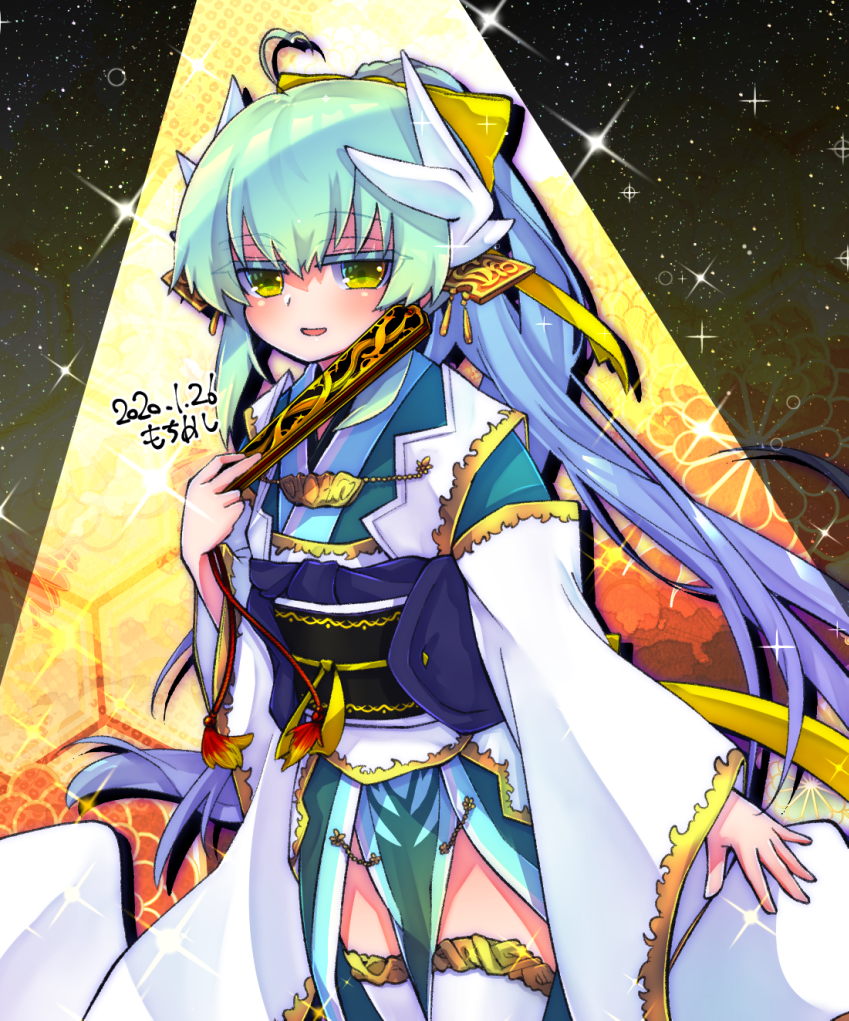 1girlahogeblue hairdragon girldragon hornsfolded fanfolding fangradient hairgreen eyesgreen hairgreen kimonohair ornamenthand fanholdingholding fanhornsjapanese clotheskimonolong hairlong sleeveslooking at viewermulticolored hairmultiple hornsopen mouthpelvic curtainsmilesolothighhighsvery long hairwhite thighhighs