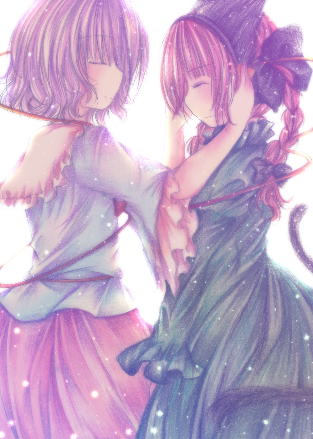 2girls, black hair, blue eyes, brown eyes, brown hair, holding hands, multiple girls, nurse, smile, thighhighs, twintails, wink