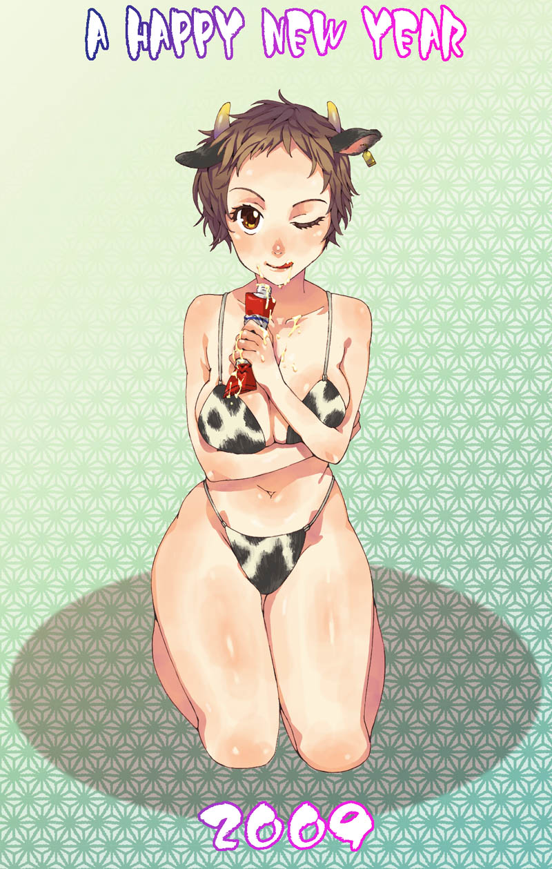 :q00s1girl2009animal earsanimal printbikinibreastschinese zodiaccleavagecondensed milkcow earscow girlcow hornscow printear tagfacing viewerfemale focushappy new yearhornskneelinglickinglooking at viewernew yearone eye closedshort hairsoloswimsuittonguetongue outwinkyear of the ox