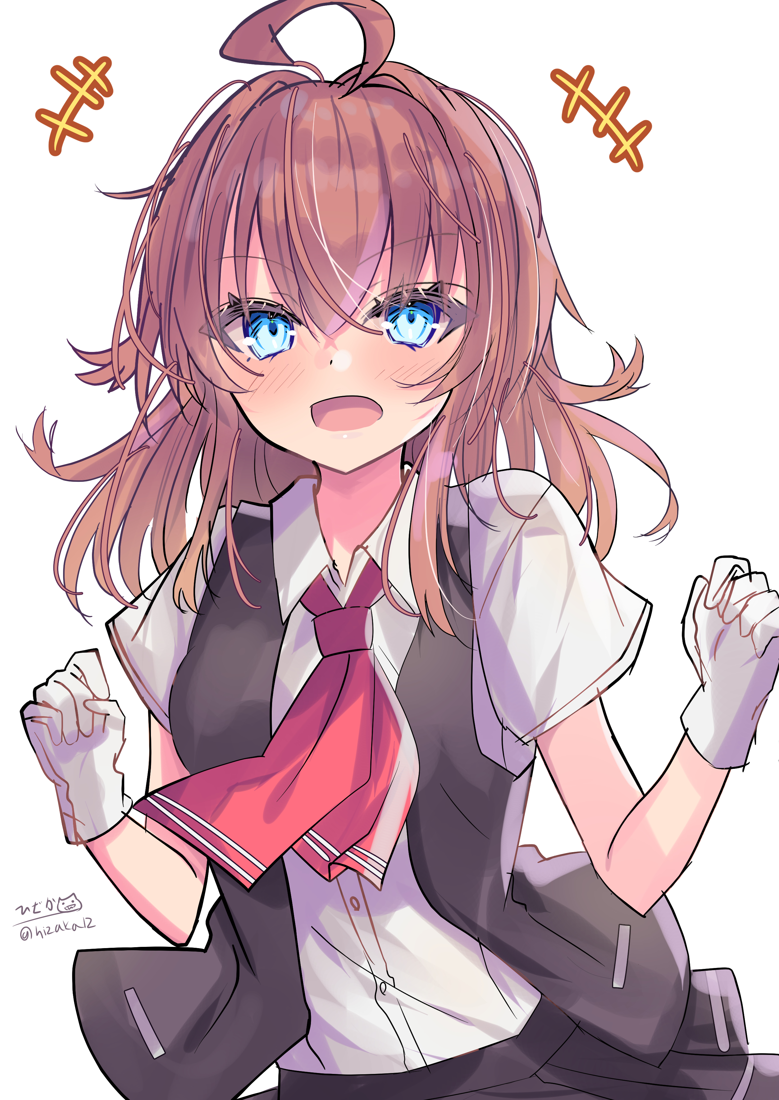 gau (n00 shi), hanamaru lily, original, commentary request, commission, skeb commission, 1girl, animal ear fluff, beret, black bow, black bowtie, blonde hair, bow, bowtie, braid, collared dress, dress, finger to cheek, hair between eyes, hair bow, hair ornament, hair ribbon, hairclip, hat, long hair, long sleeves, looking at viewer, mismatched pupils, open mouth, pink dress, pink hat, red eyes, red ribbon, ribbon, smile, solo, star-shaped pupils, star (symbol), star hair ornament, symbol-shaped pupils, twin braids