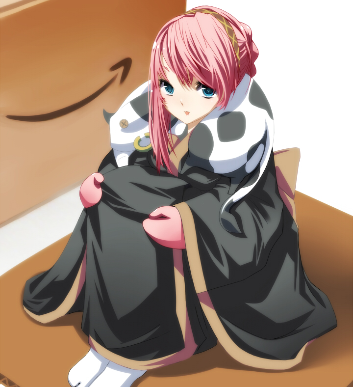 blue eyesboxcardboardcardboard boxcowjapanese clotheskimonomittenspink hairscarfsittingsockssolo