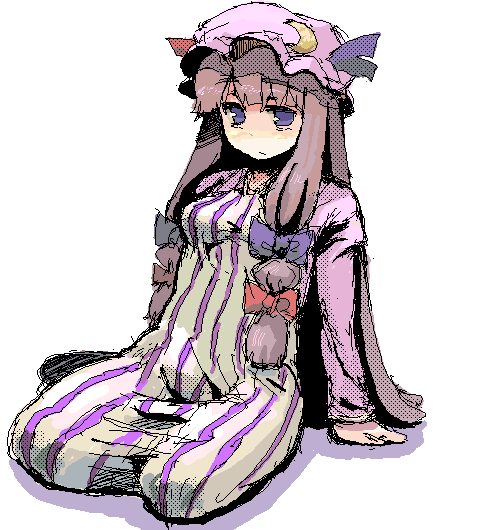 1girlbreastscrescentcrescent hat ornamentfemale focusfull bodyhathat ornamentlong hairoekakipurple eyespurple hairribbonsimple backgroundsittingsolowhite background