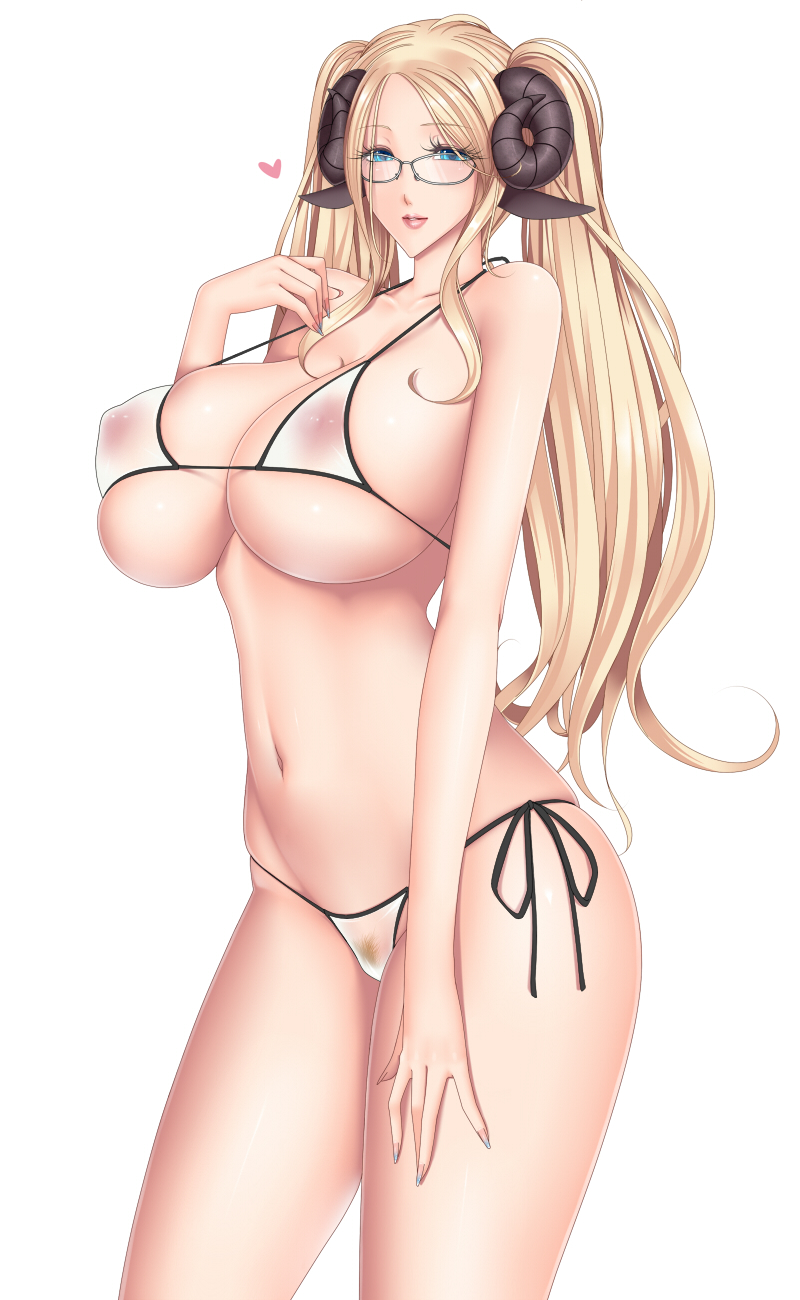 animal earsareolaebikiniblonde hairblue eyesbreastscurvydemon girlfemaleFlag for Deletionglassesgoat earsgoat hornshornshuge breastslipslong hairlong twintailslooking at viewernavelnipplespubic hairpussysee throughsolostandingstring bikinisuccubusswimsuittied hairtwintailsuncensoredwhite bikiniwhite swimsuit