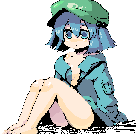 1girlbarefootblue eyesblue hairfeetfemale focushair bobbleshair ornamenthatmatching hair/eyesoekakishort hairsolotwo side up