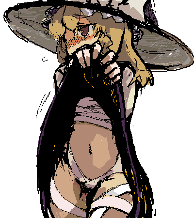 1girlbandagesblonde hairblushclothes liftdressdress liftfemale focushatlifting own clothesoekakisarashisolowhite backgroundwitch hatyellow eyes