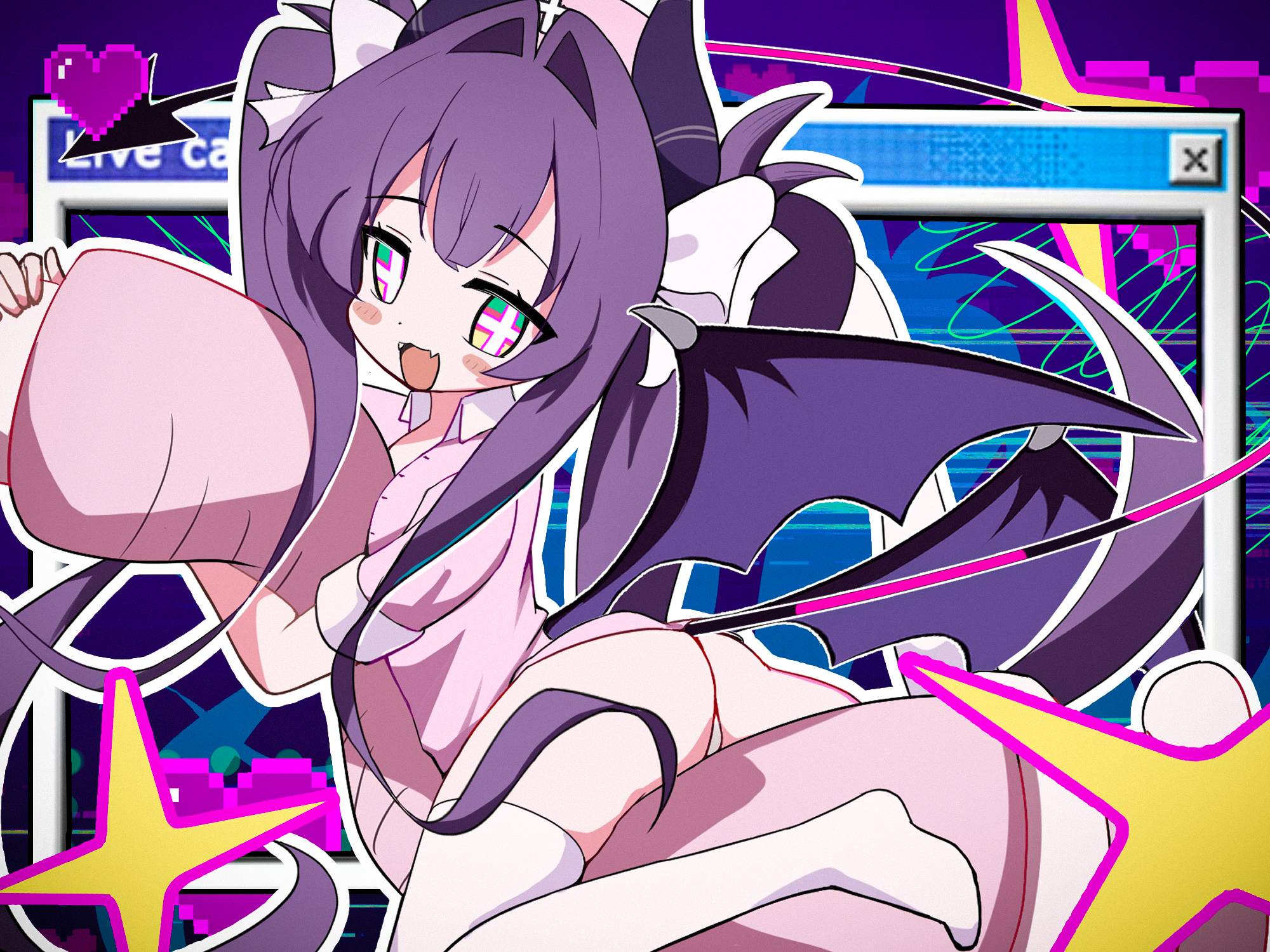 1girlbowcross-shaped pupilsdemon hornsdemon taildemon wingsfanghair bowhair intakeshathornshugging objectlong hairlooking at viewermulticolored eyesno pantsnurse capopen clothesopen mouthopen shirtpantiespink shirtpurple hairshirtskin fangsmilesolostriped tailsymbol-shaped pupilstailthighhighstwintailsunderwearwhite bowwhite pantieswhite thighhighswindow (computing)wingsyunyun (yunyun denpa syndrome)