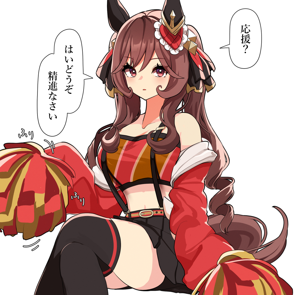 1girlalternate costumebrown haircheerleadercrop topdrill hairheart ear ornamentheart-shaped ornamentholdingholding pom pomsnavelpom pom (cheerleading)pom pomsred eyessimple backgroundsolospeech bubblewhite background