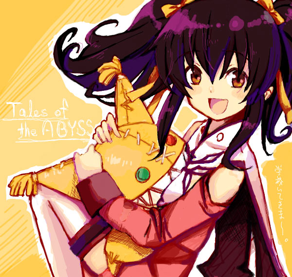 :d00s1girlbare shouldersblushbreastsbutton eyesbuttonscopyright namedetached sleeveshair ribbonlarge breastslong hairlong sleeveslooking at vieweropen mouthorange ribbonpurple hairribbonsimple backgroundsittingsmilestuffed toytaremethighhighstwintailswhite thighhighsyellow backgroundzettai ryouiki